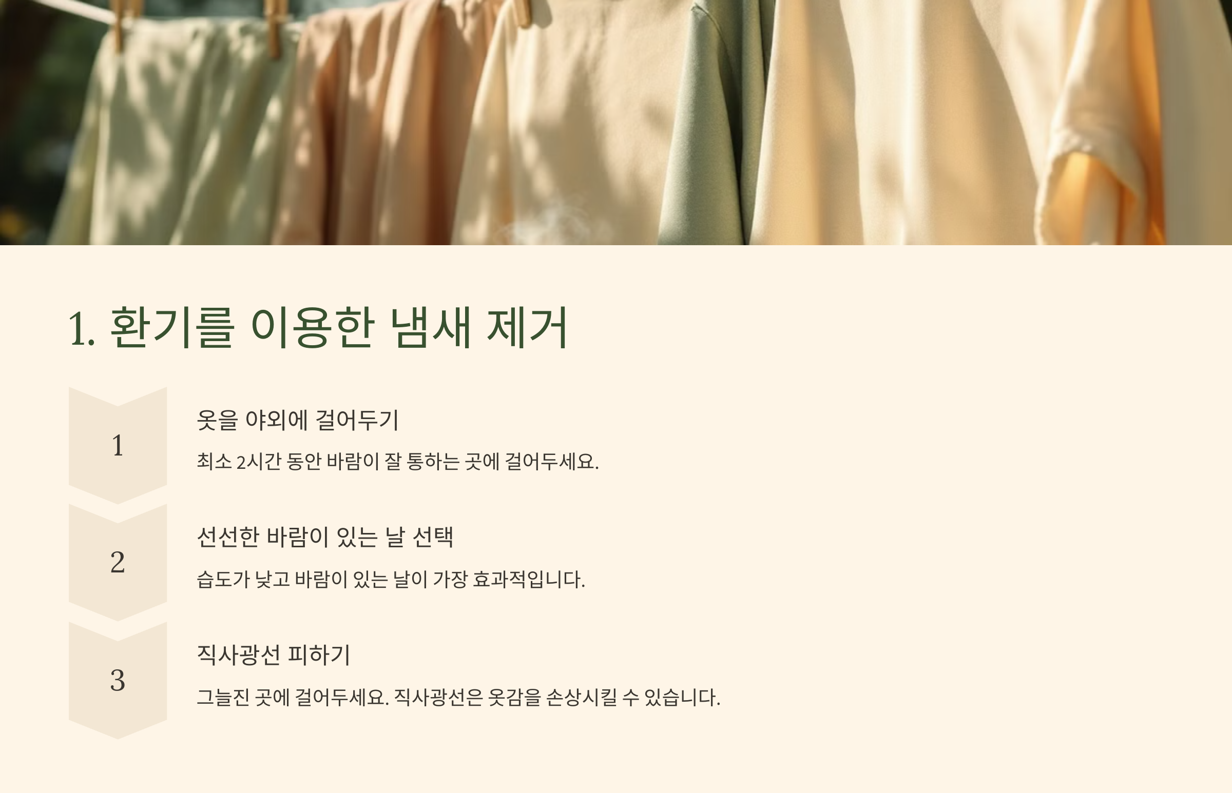 | 햇볕 노출 | 자외선 효과로 냄새 제거 | 색 바램 가능성 있음 |