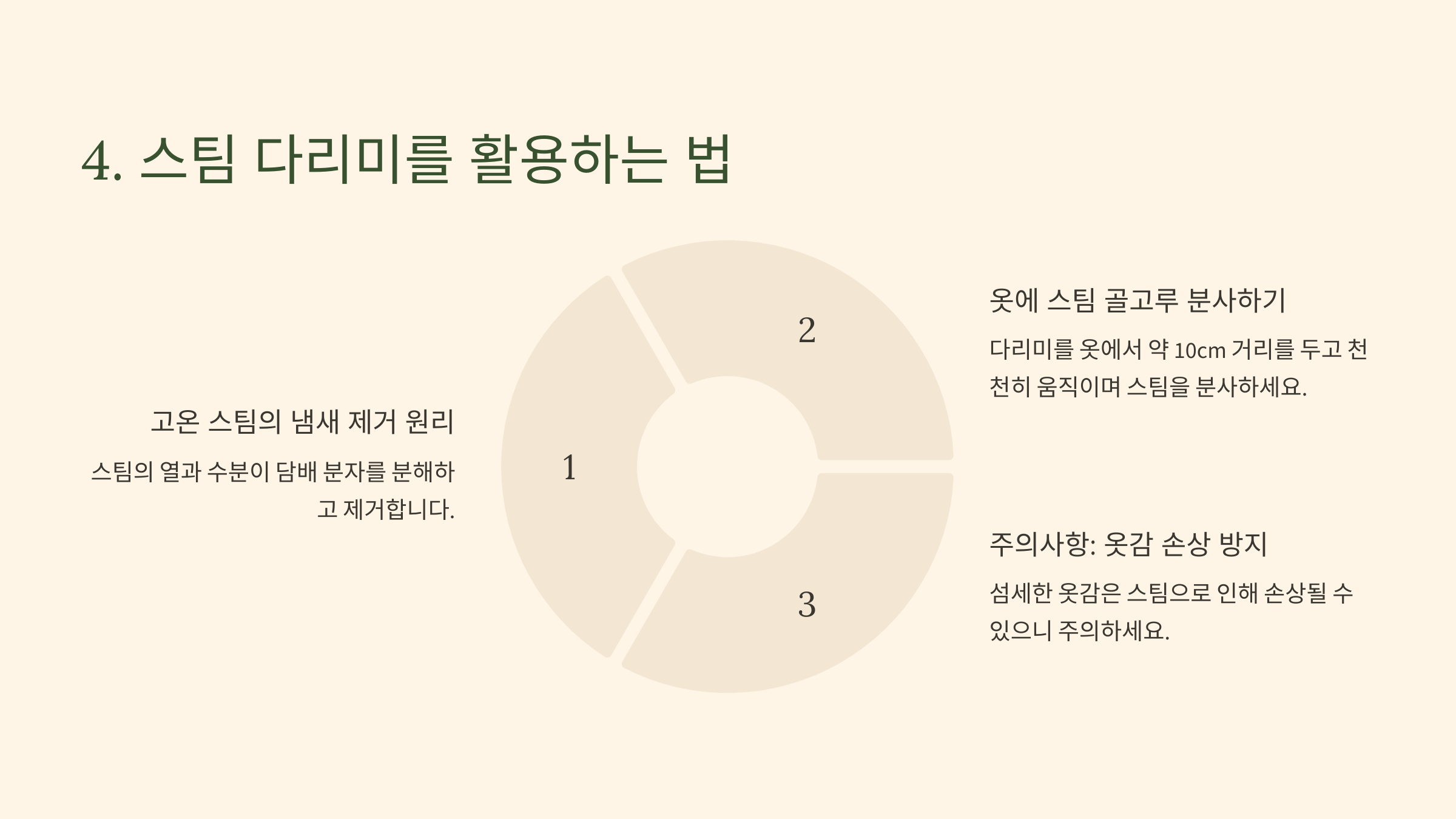방법은 간단해요! 옷걸이에 담배 냄새가 밴 옷을 걸어두고, 스팀 다리미로 전체적으로 골고루 증기를 쐬어주세요. 특히 냄새가 심한 부분은 조금 더 집중적으로 스팀을 가하면 효과가 좋아요.