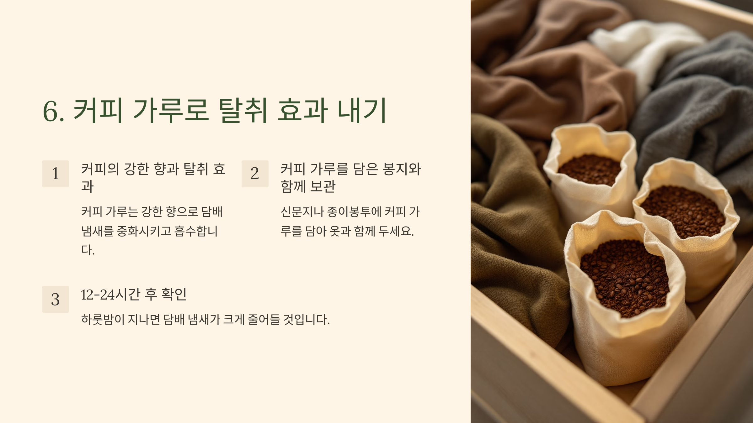 방법은 간단해요! 지퍼백이나 밀폐용기에 냄새 밴 옷을 넣고, 커피 가루(혹은 원두 찌꺼기)를 작은 그릇에 담아 함께 넣어두세요. 하루 정도 지나면 옷의 담배 냄새가 사라진 걸 확인할 수 있을 거예요.