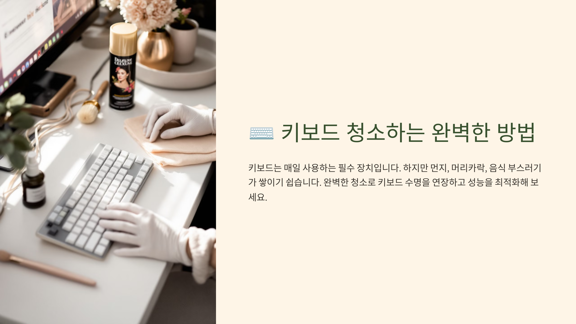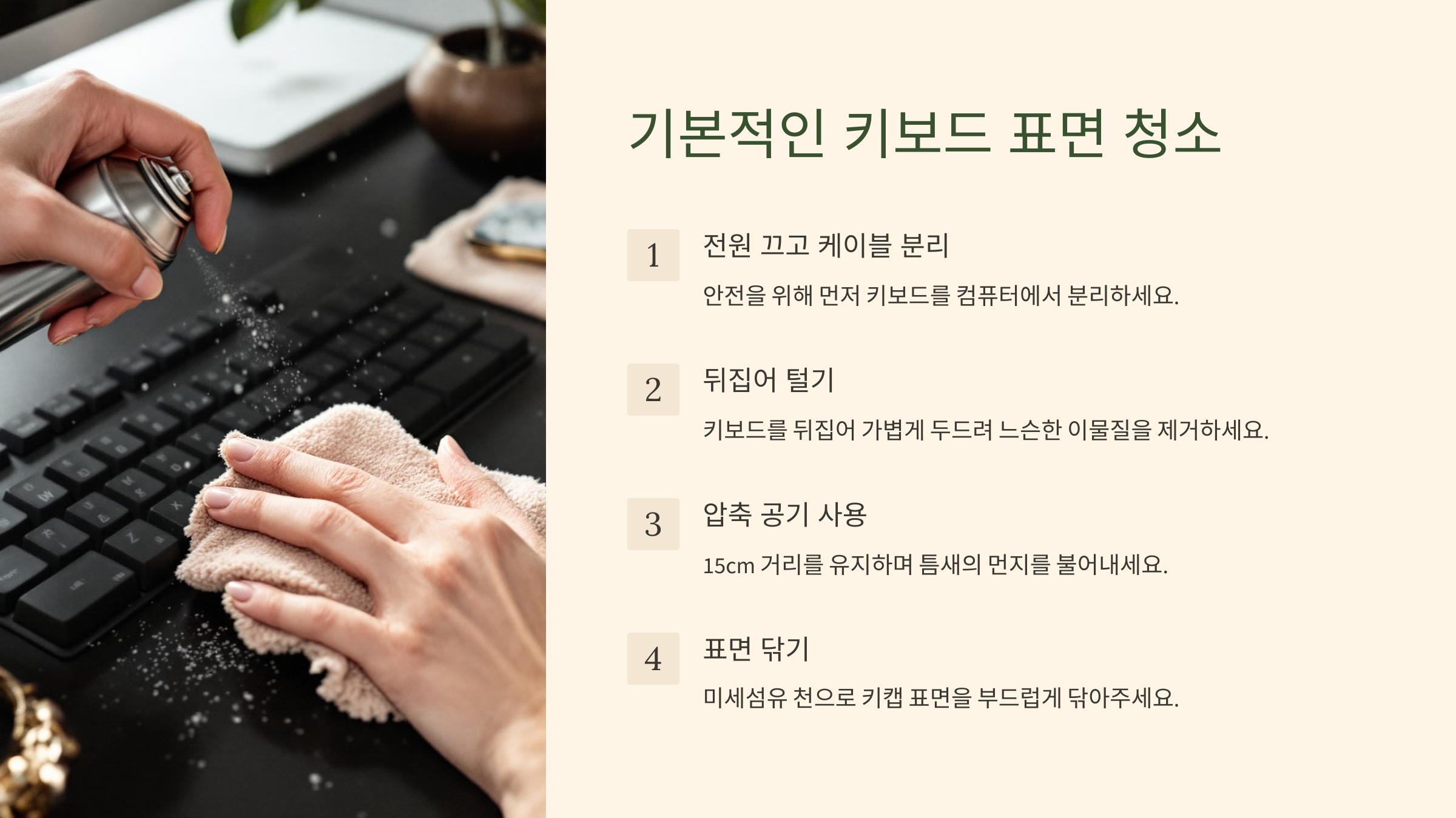 키보드는 매일 사용하는 만큼 손때, 먼지, 세균이 쉽게 쌓이는 부분이에요. 특히 키 사이에 낀 먼지는 타이핑 감도를 떨어뜨리고 오작동을 유발할 수도 있습니다. ⌨️