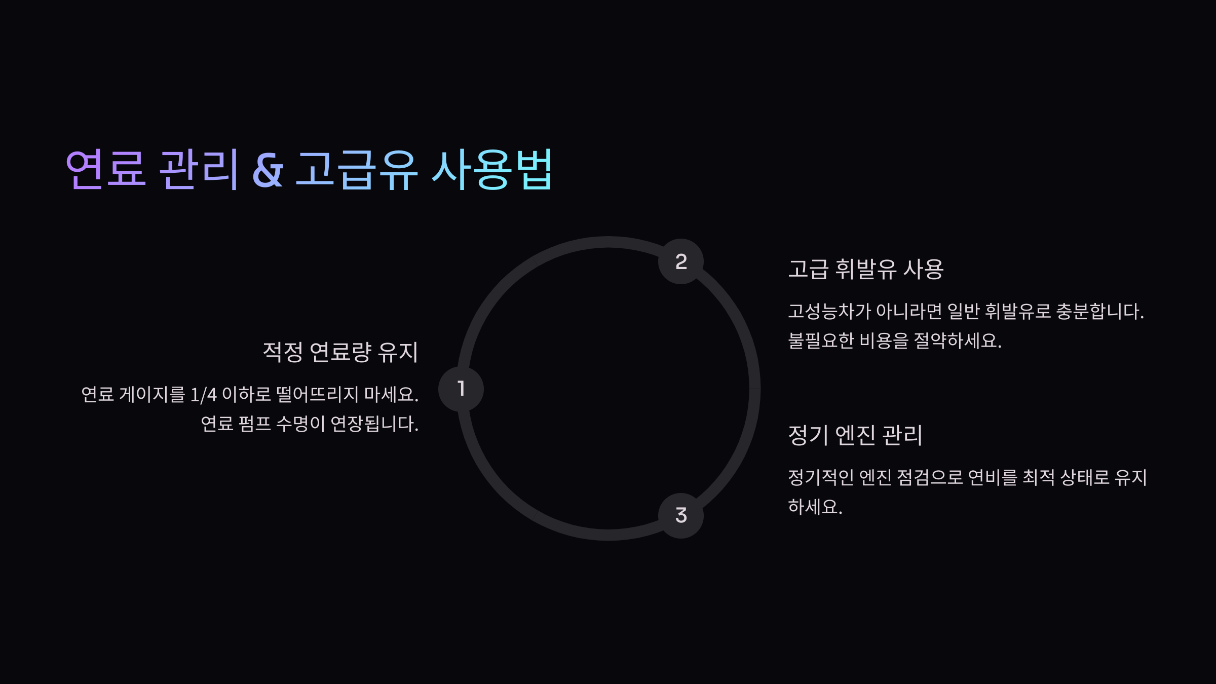 ✔ 연료 관리 & 고급유 활용법 1️⃣ 연료는 너무 가득 채우지 말고 70~80% 수준에서 유지하는 것이 좋아요. 2️⃣ 신뢰할 수 있는 주유소에서 연료를 주입하면 엔진 성능이 유지돼요. 3️⃣ 고급유는 특정 차량(고성능 스포츠카, 터보 엔진)에 적합하며, 일반 차량은 일반유로도 충분해요.