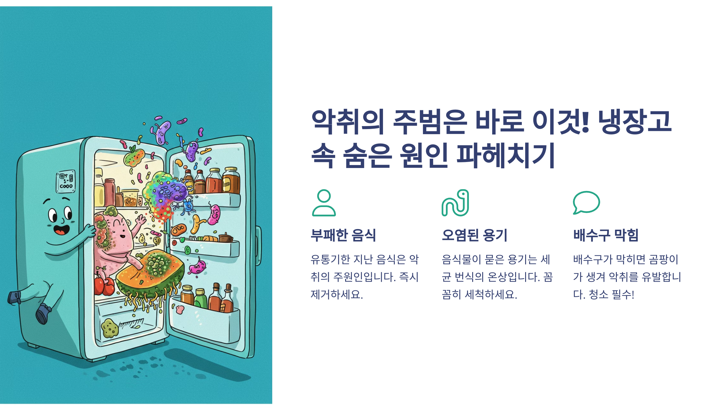 냉장고 냄새를 효과적으로 제거하려면 원인을 먼저 파악하고, 올바른 방법으로 청소하는 것이 중요해요. 또한, 냉장고 냄새가 다시 발생하지 않도록 관리하는 방법도 함께 알아두면 좋아요.