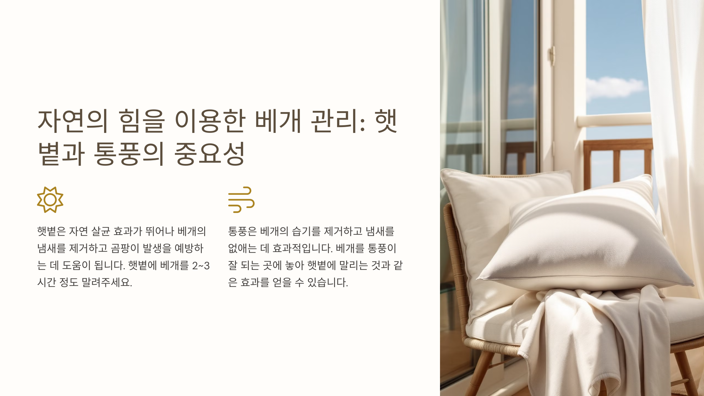 햇볕과 바람은 가장 자연스럽고 강력한 탈취 방법이에요. 특히 햇볕은 살균 효과가 뛰어나서 베개의 세균과 진드기 제거에도 좋아요.
