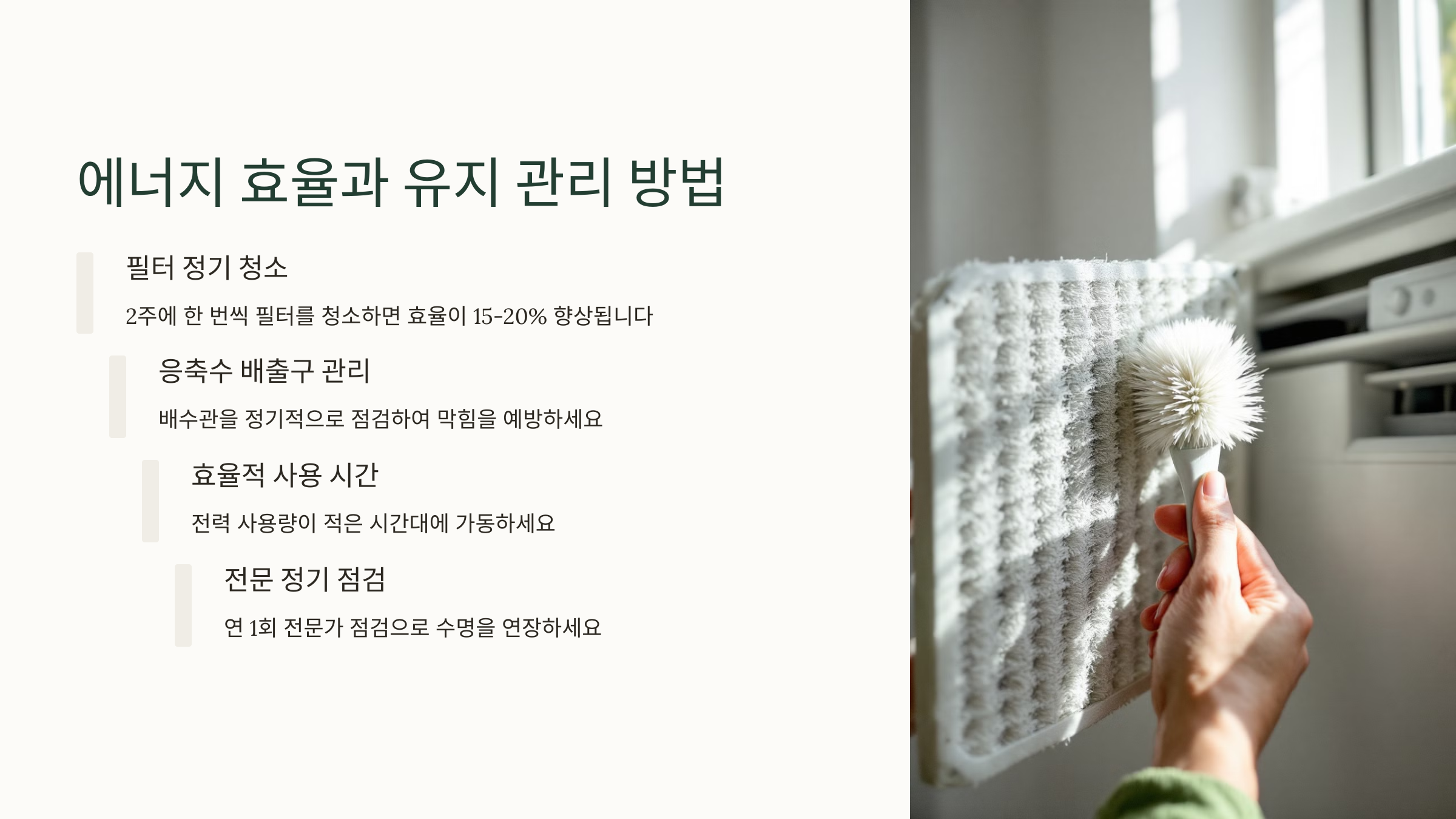 또 하나의 차이점은 에너지 효율이에요. 제습기는 냉매를 사용하지 않거나, 사용해도 좁은 범위에 집중되기 때문에 전력 소비가 적은 편이에요. 반면 에어컨은 냉매 순환 범위가 크고 컴프레서 작동 시간이 길어 전기를 더 많이 소비하게 되죠.