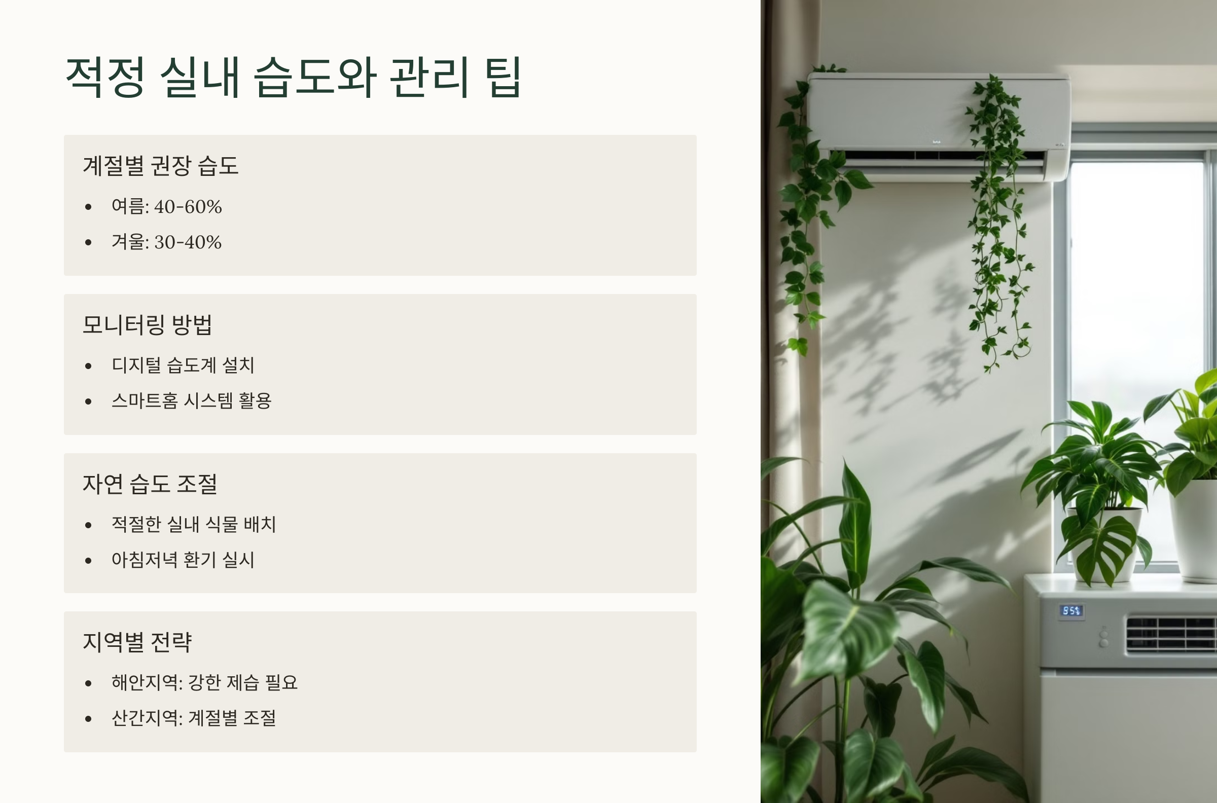 여름철에는 외부 습도가 70% 이상까지 올라가기 때문에 에어컨을 적절히 활용해 50% 안팎으로 유지해주는 게 좋아요. 특히 장마철에는 실내 벽이나 옷장, 매트리스 아래 등 습기 취약 지역을 중심으로 신경 써야 해요. 숨겨진 습기가 곰팡이의 온상이 되기 쉽거든요!