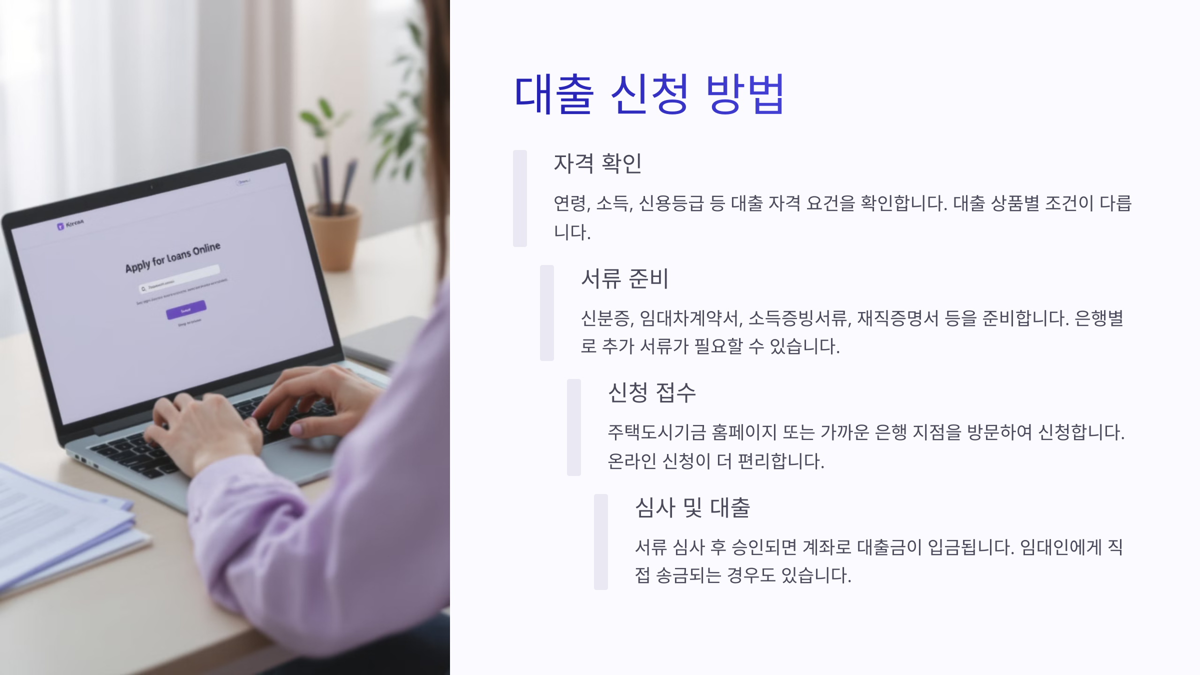 | 2. 서류 제출 | 소득증빙, 신분증, 임대차 계약서 제출 |