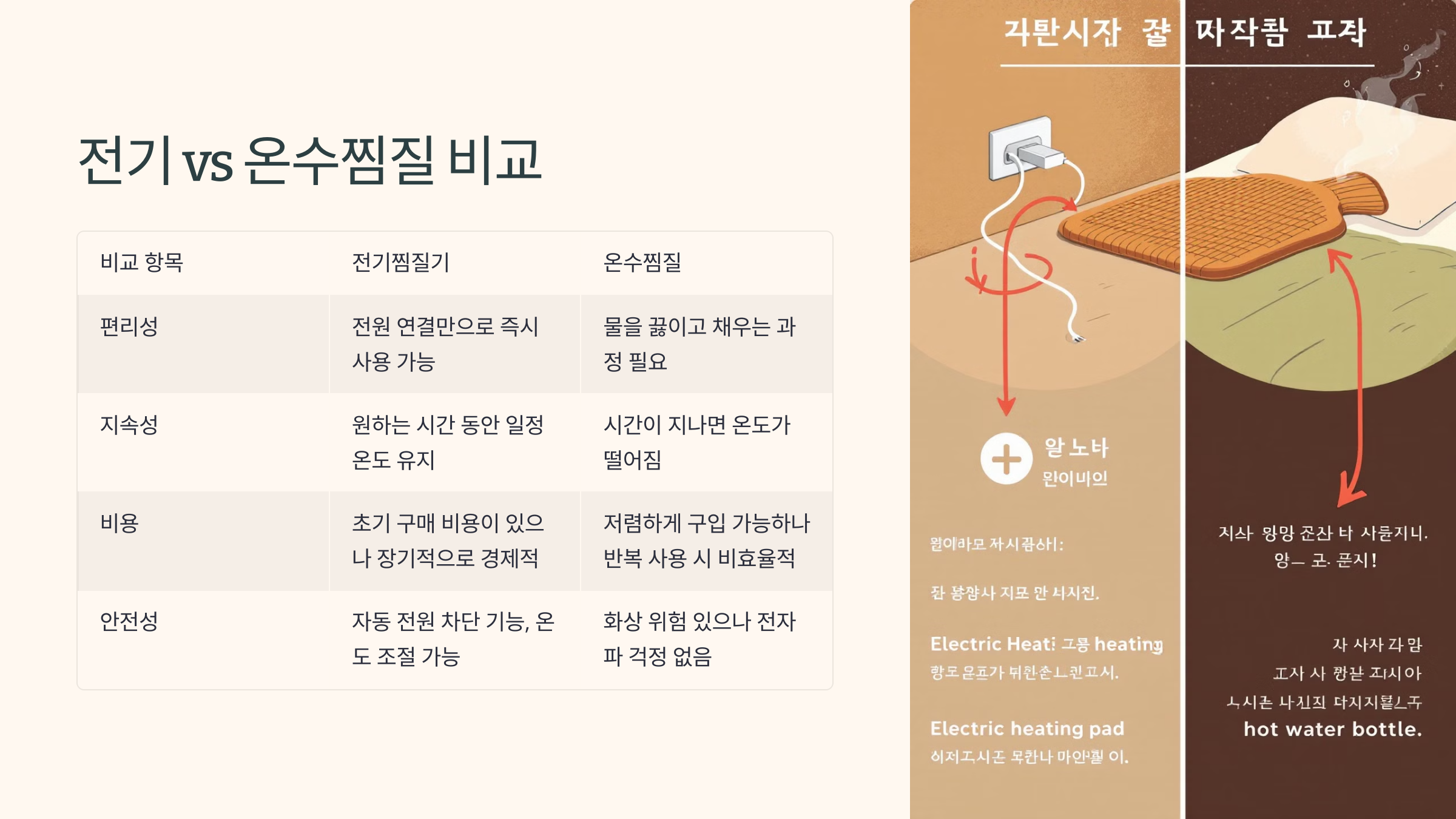 한마디로 말하면, 간편함과 지속적인 열 효과를 원한다면 전기찜질기를 추천하고, 천연의 습열감을 선호한다면 온수찜질도 괜찮은 선택이에요 👍