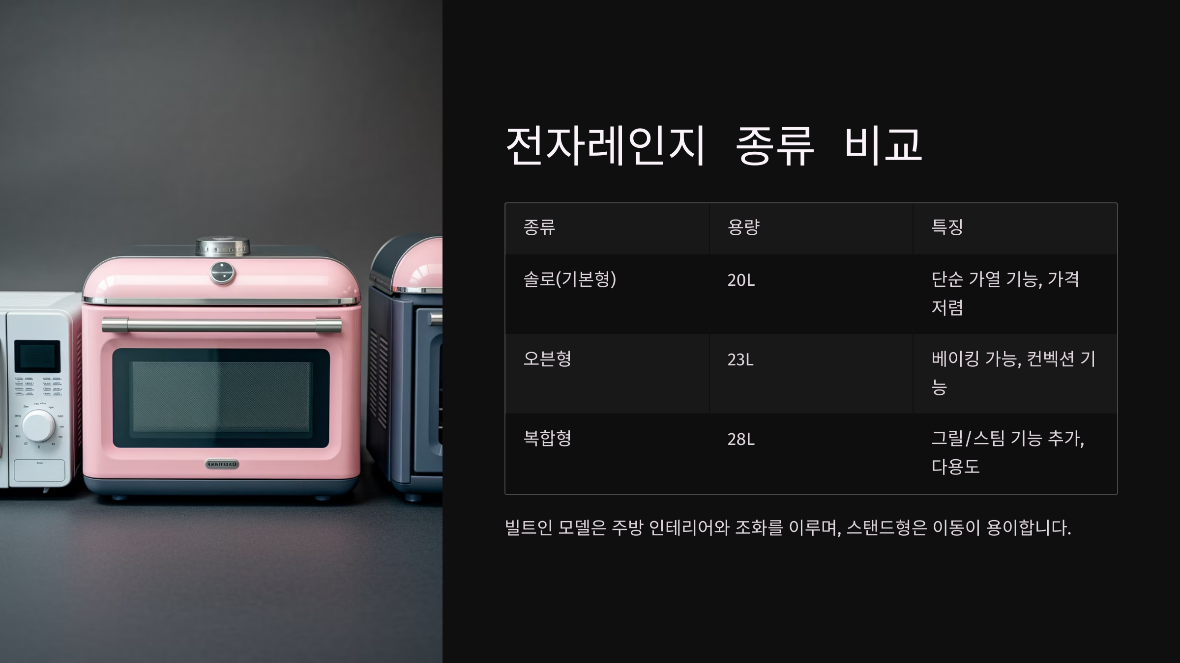 전자레인지는 크게 3가지 타입으로 나뉘어요! 기능과 가격, 활용도에서 차이가 나니까