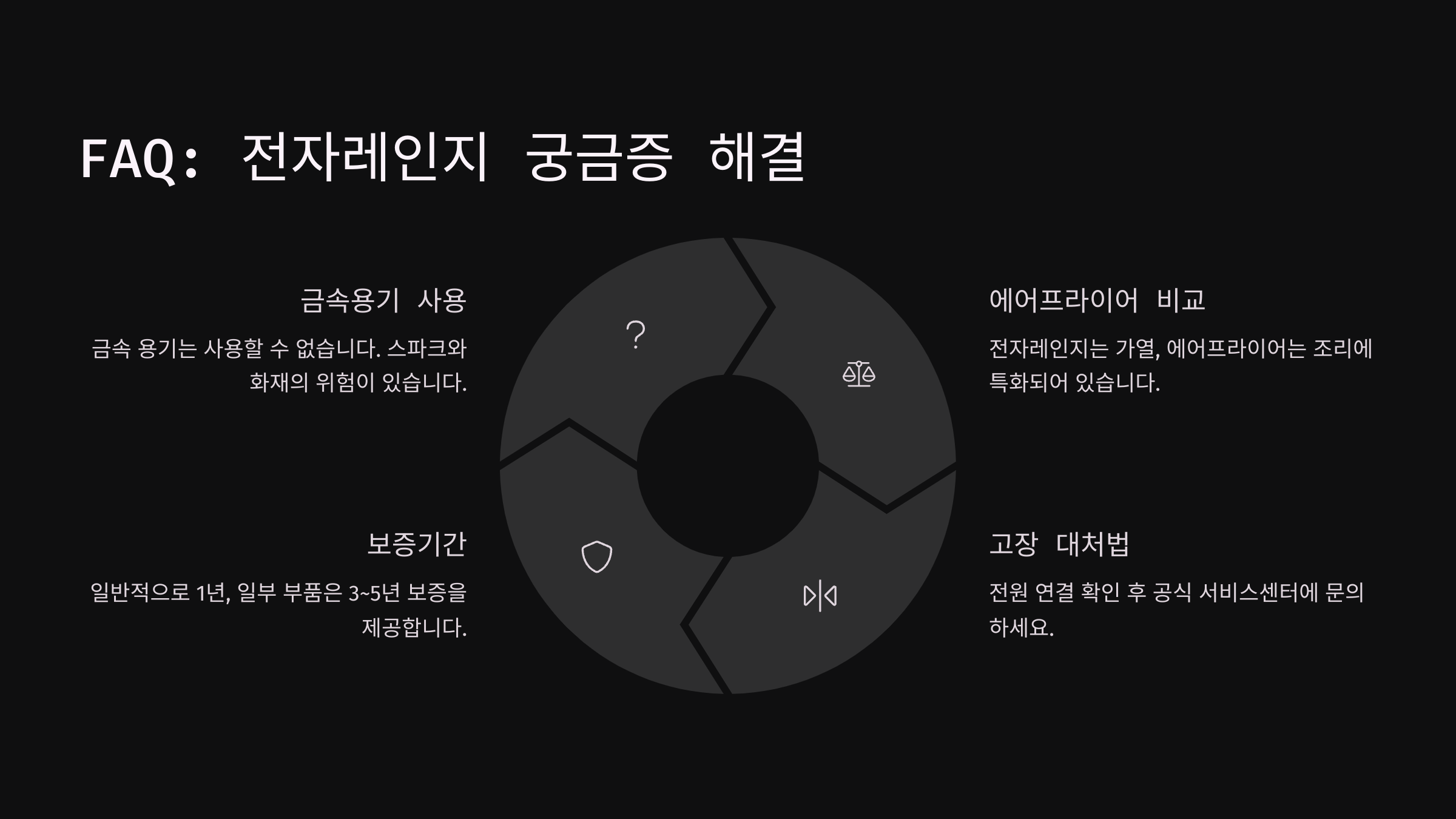 이제 전자레인지 고르기 훨씬 쉬워지셨죠? 😄 그럼 마지막 섹션! ❓ 전자레인지 FAQ로 깔끔하게 마무리해드릴게요!