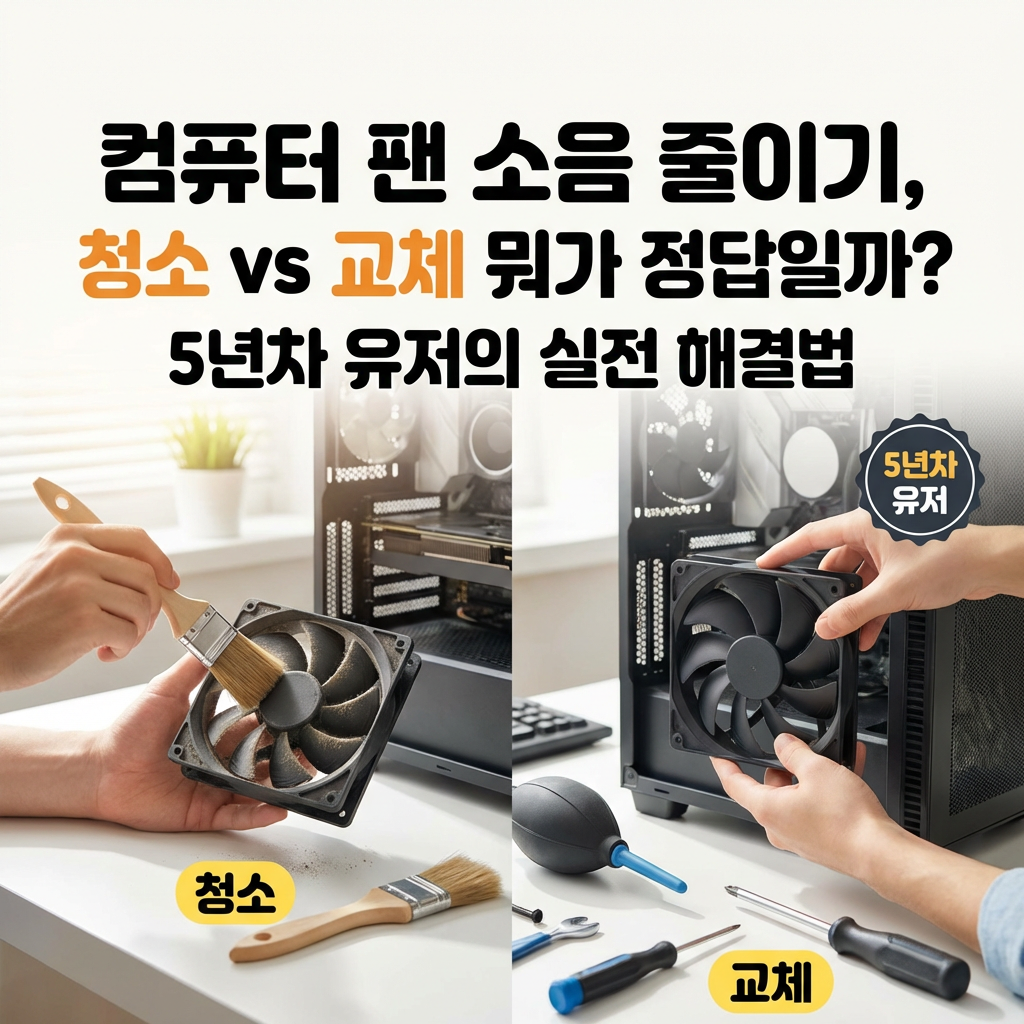 청소할 때 WD-40 같은 윤활유는 절대 뿌리지 마세요. 일시적으로 소음이 줄어들 수 있지만, 팬 베어링을 망가뜨려서 결국 더 빨리 교체해야 하는 상황이 옵니다. 먼지 제거는 압축 공기 캔이나 에어 블로어로 하시고, 청소 후에도 소음이 심하면 그때 교체를 고려하세요.