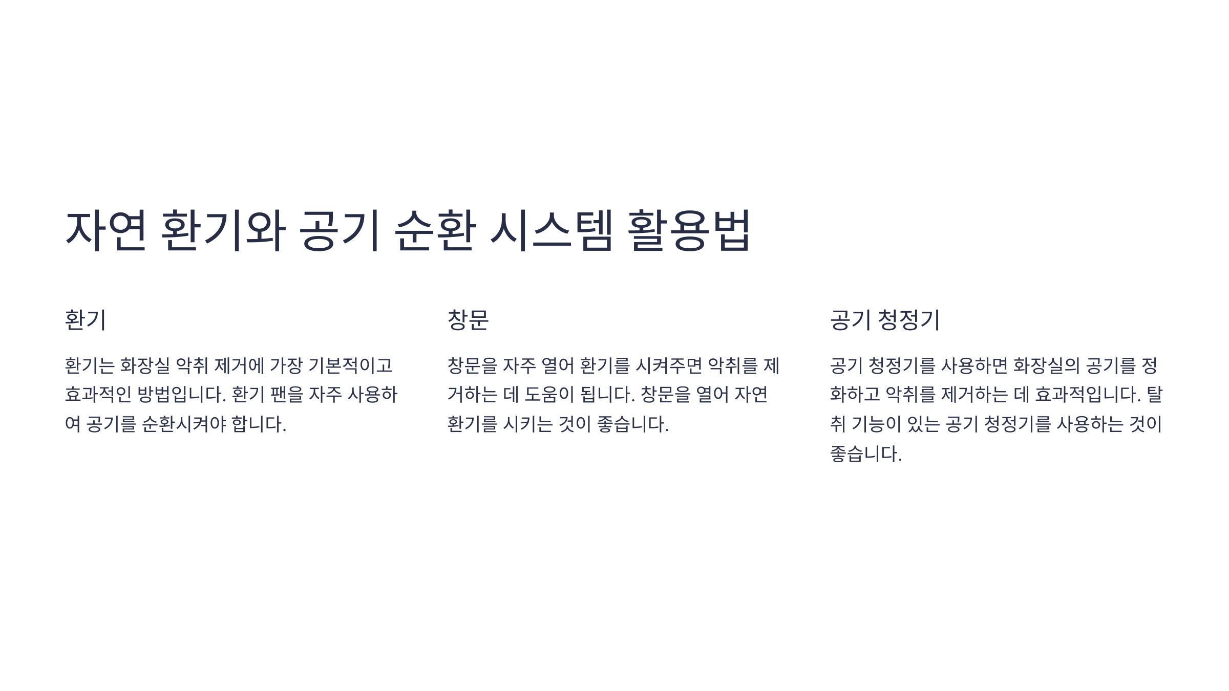 화장실 악취를 제거하려면 공기 순환이 필수예요. 환기가 잘되지 않으면 냄새뿐만 아니라 습기로 인해 곰팡이도 생기기 쉬워요.