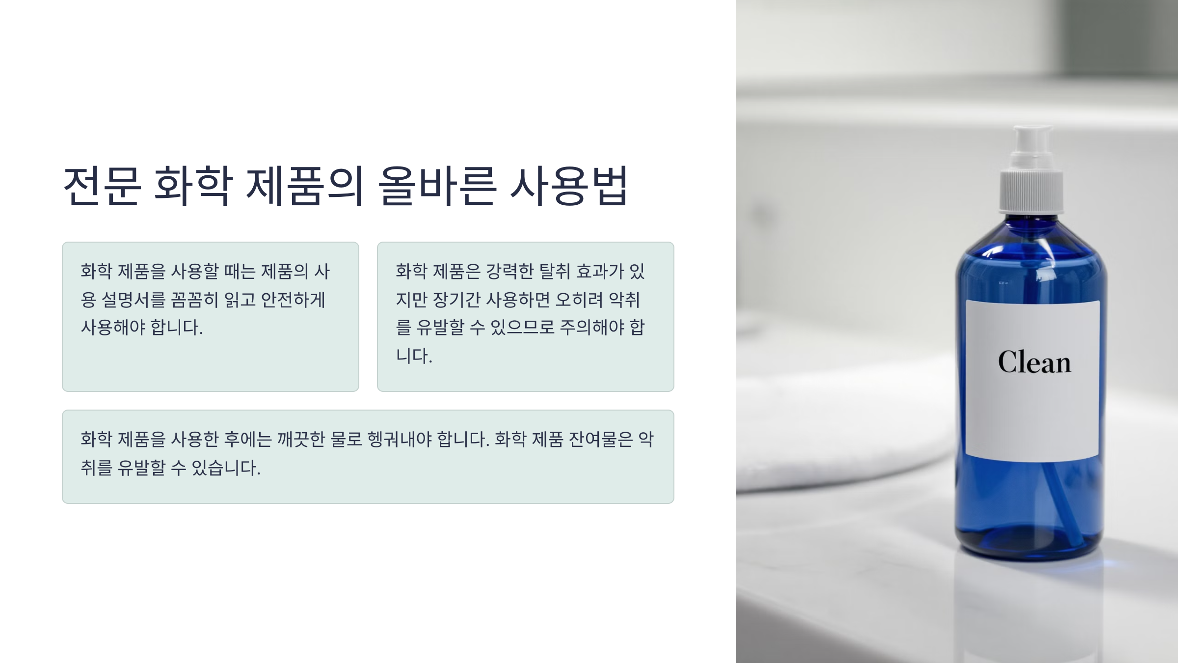 화학 제품을 적절히 활용하면 냄새를 빠르게 제거할 수 있어요. 하지만 너무 자주 사용하면 환경에 좋지 않을 수도 있으니 자연적인 방법과 병행하는 게 좋아요.