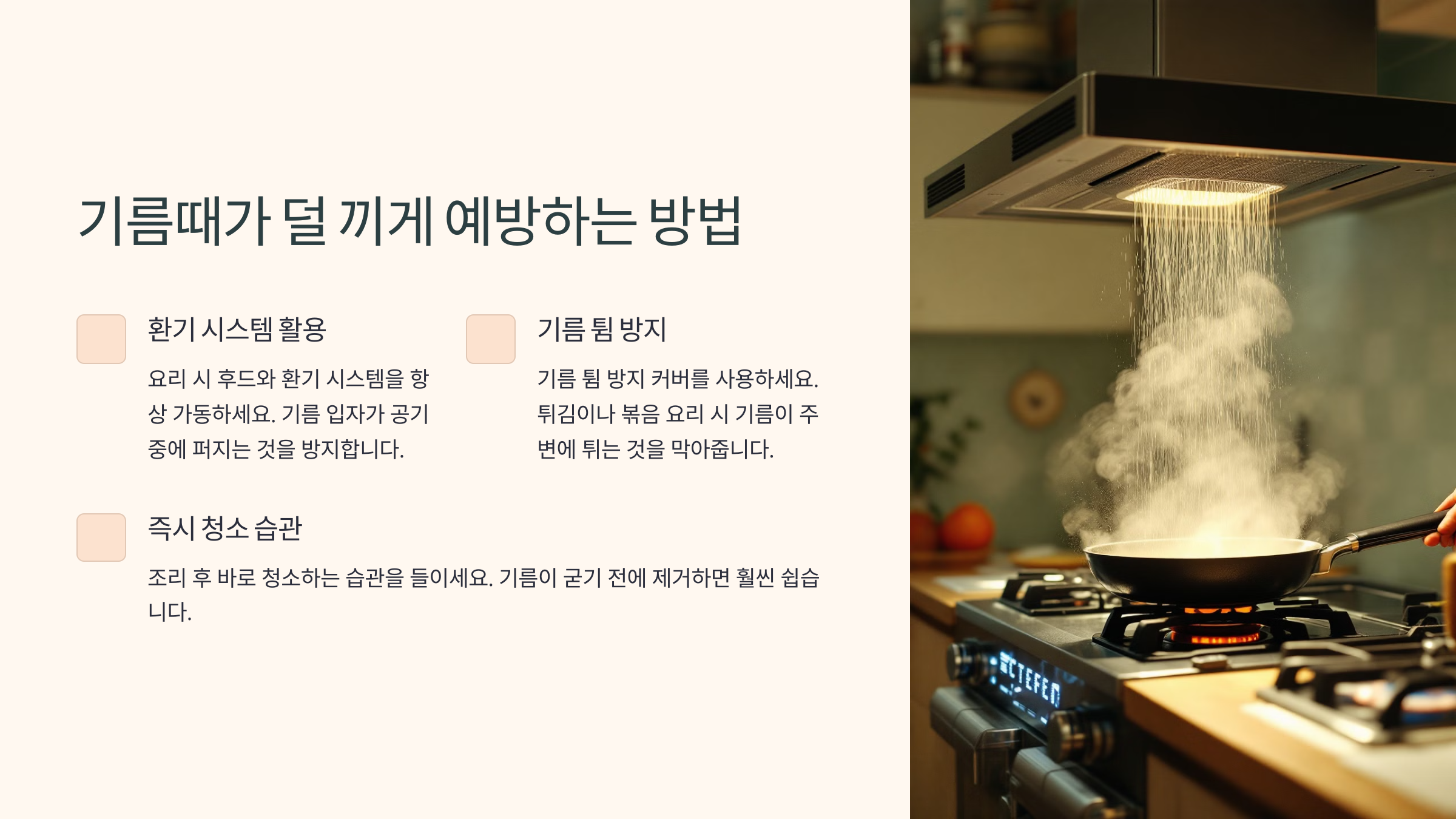 | 요리 후 바로 닦기 | 기름때 최소화 | 습관 들이기가 어려움 |