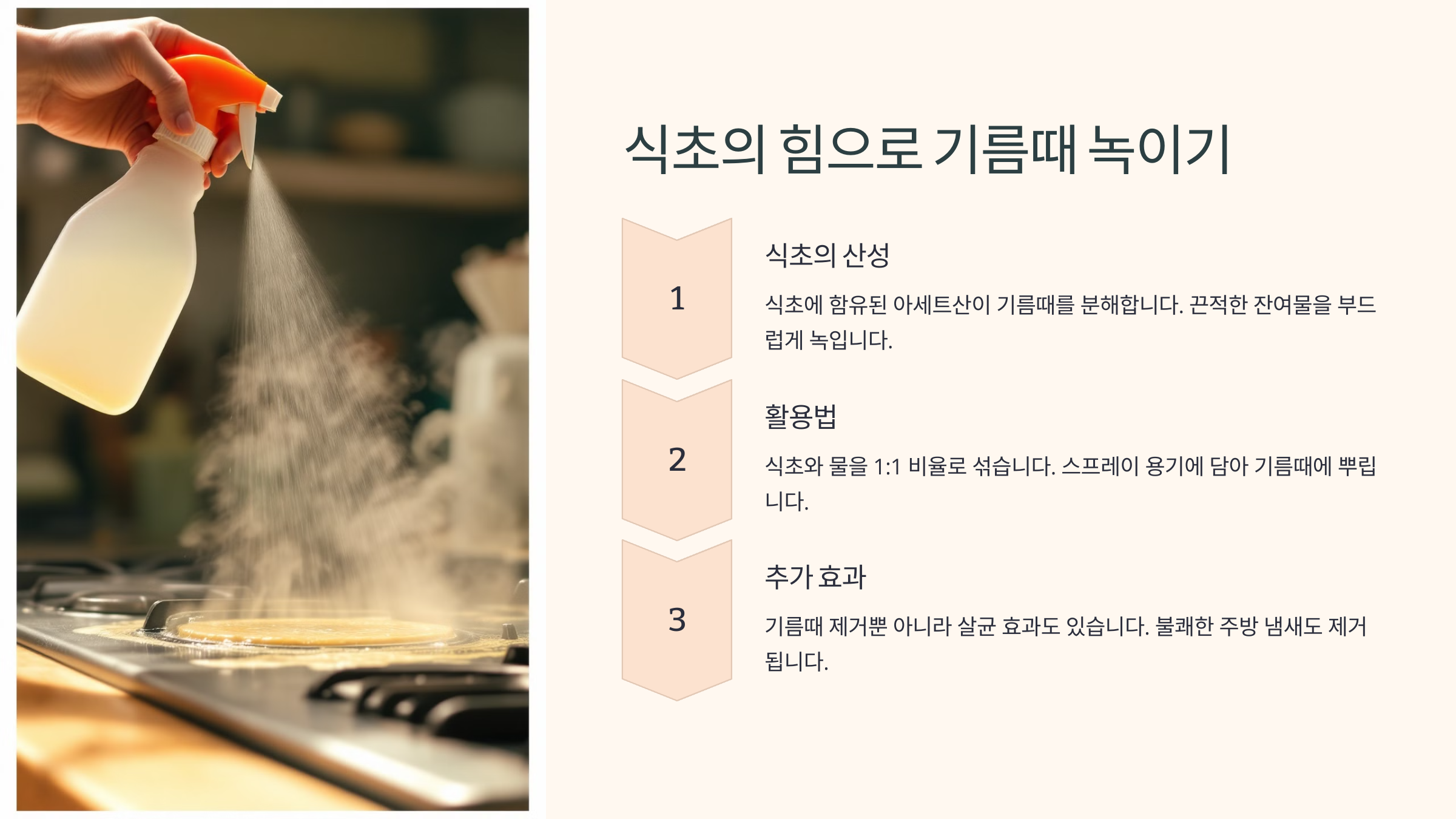 방법은 간단해요! 분무기에 식초와 물을 1:1 비율로 섞어 기름때가 낀 곳에 뿌린 후, 5~10분 정도 기다렸다가 닦아보세요. 그러면 기름때가 쉽게 녹아 나와요! 🧴