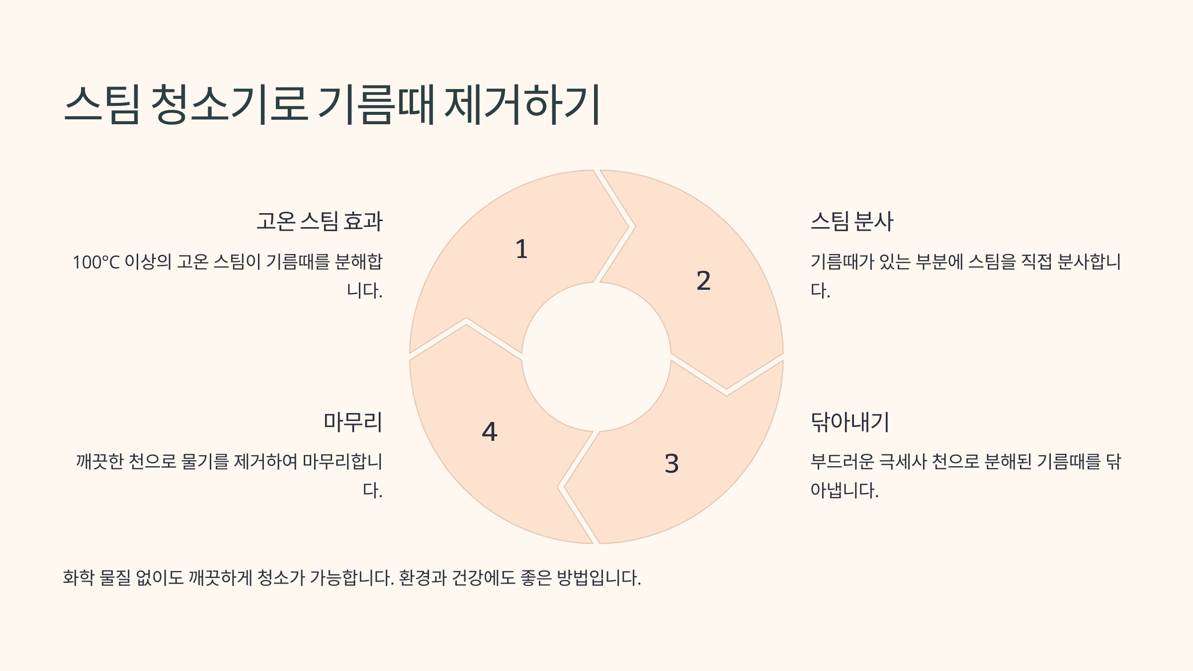 방법은 간단해요! 스팀 청소기를 기름때가 낀 부분에 가까이 대고 10~15초 정도 수증기를 분사한 뒤, 마른 천이나 키친타월로 닦아주세요. 그러면 기름이 부드럽게 녹아내려 쉽게 제거할 수 있어요! 😊