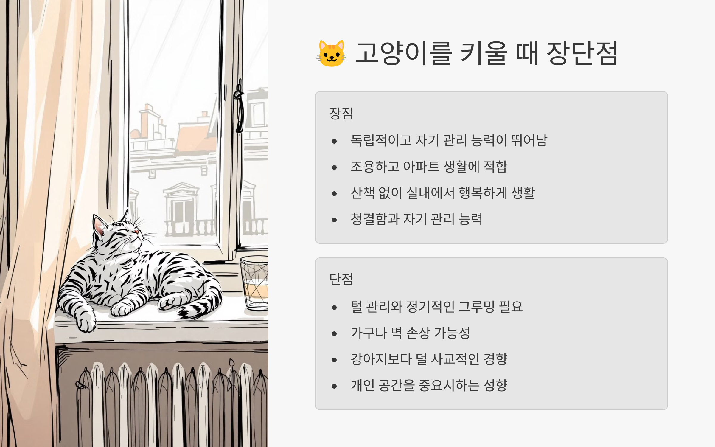 📢 이제 고양이를 키울 때의 장점과 단점을 알아볼까요? 🐱