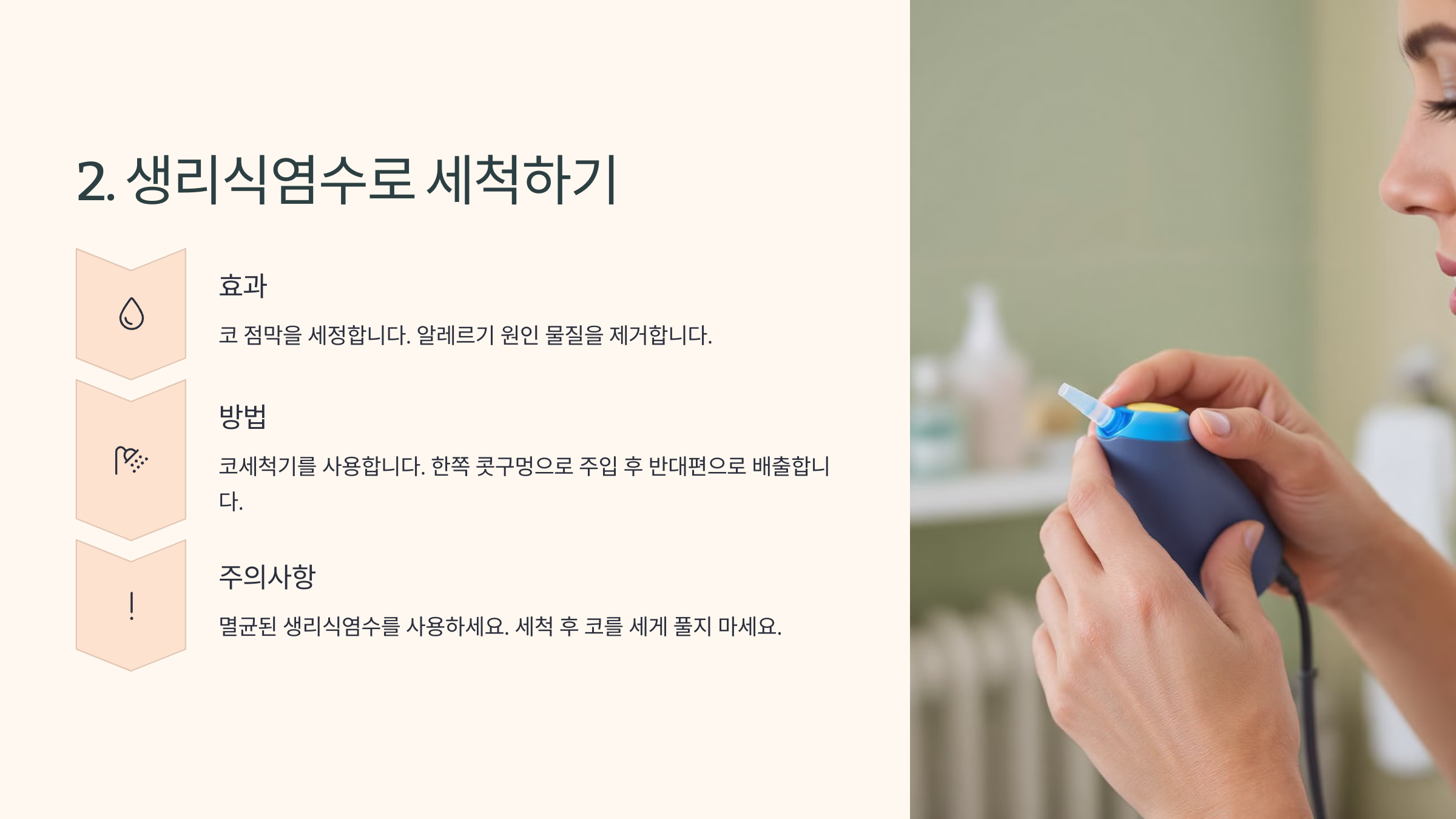 수증기를 흡입하면 코막힘이 자연스럽게 풀리고, 점막이 촉촉해져서 숨쉬기가 편안해져요! 하지만 생리식염수로 코를 세척하는 것도 코막힘을 빠르게 뚫는 효과적인 방법인데요. 다음 섹션에서 생리식염수를 이용한 코 세척법과 효과를 확인해 보세요! 💧