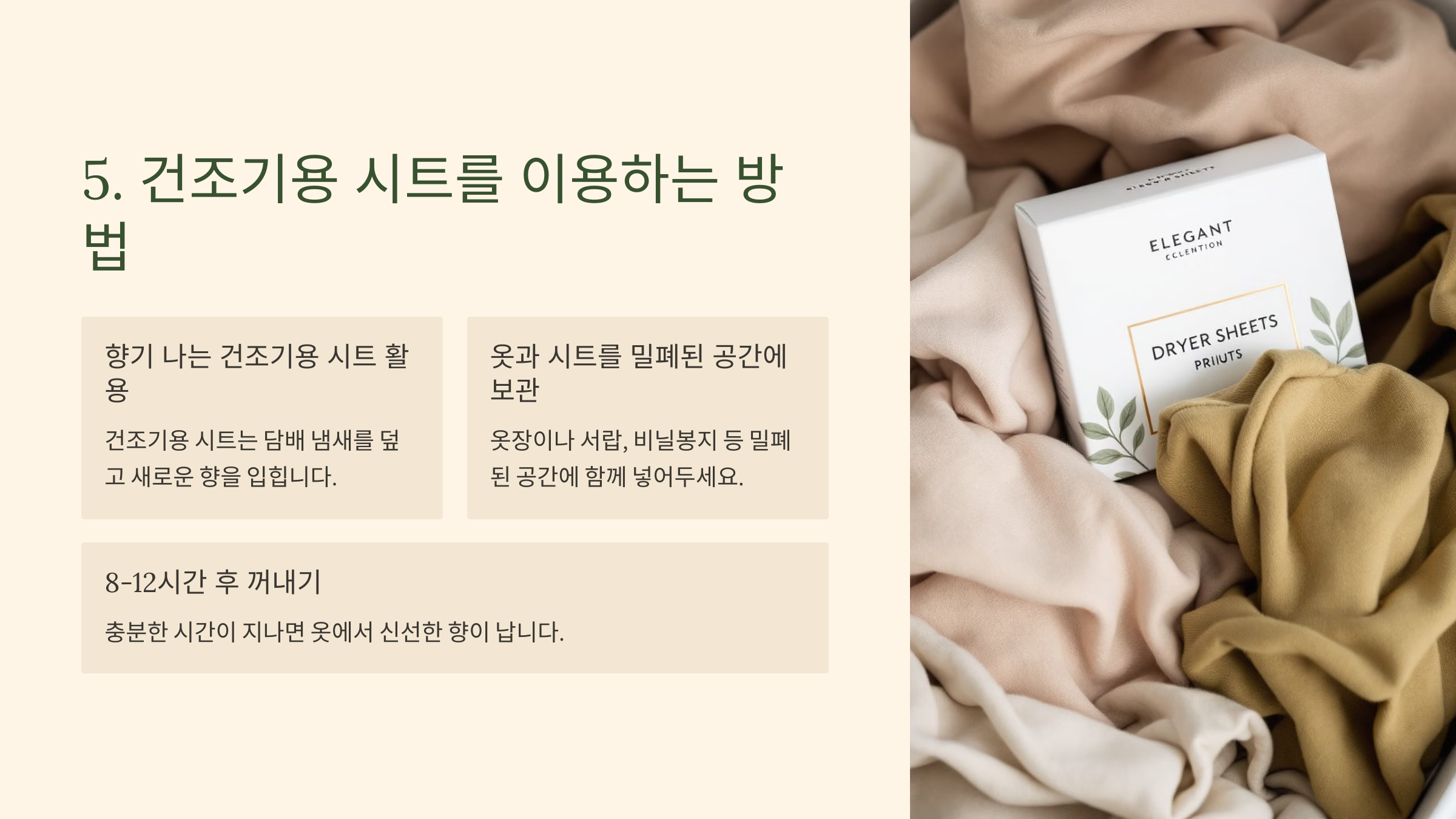 방법은 아주 간단해요! 냄새가 밴 옷을 건조기에 넣고 건조기용 시트(섬유 유연제 시트)를 함께 넣어 10~15분 동안 약한 온도로 돌려주세요. 그러면 담배 냄새가 많이 줄어들 거예요.
