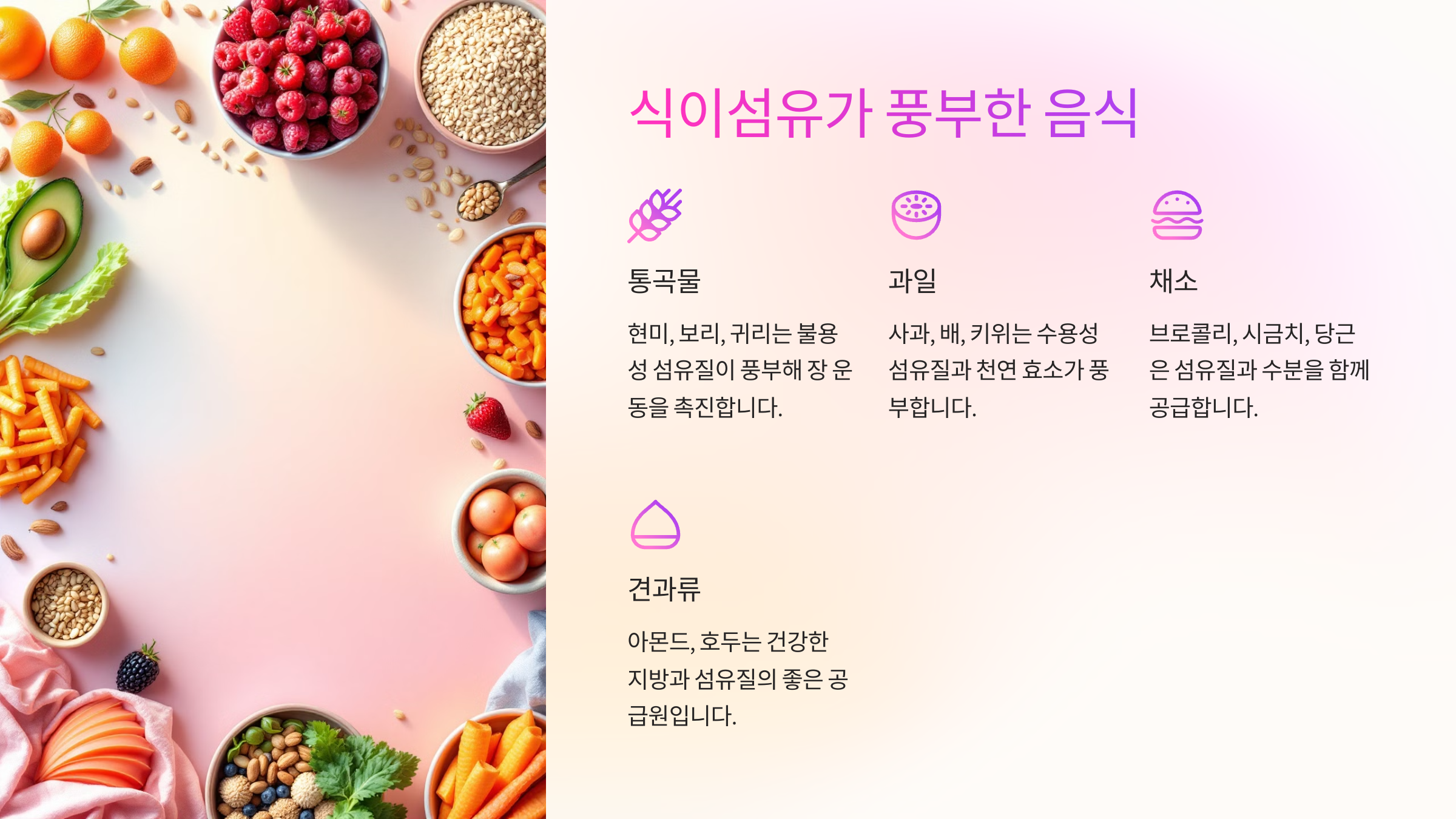 - 🍎 천연 식이섬유 섭취: 가공식품 대신 신선한 과일과 채소를 많이 드세요.