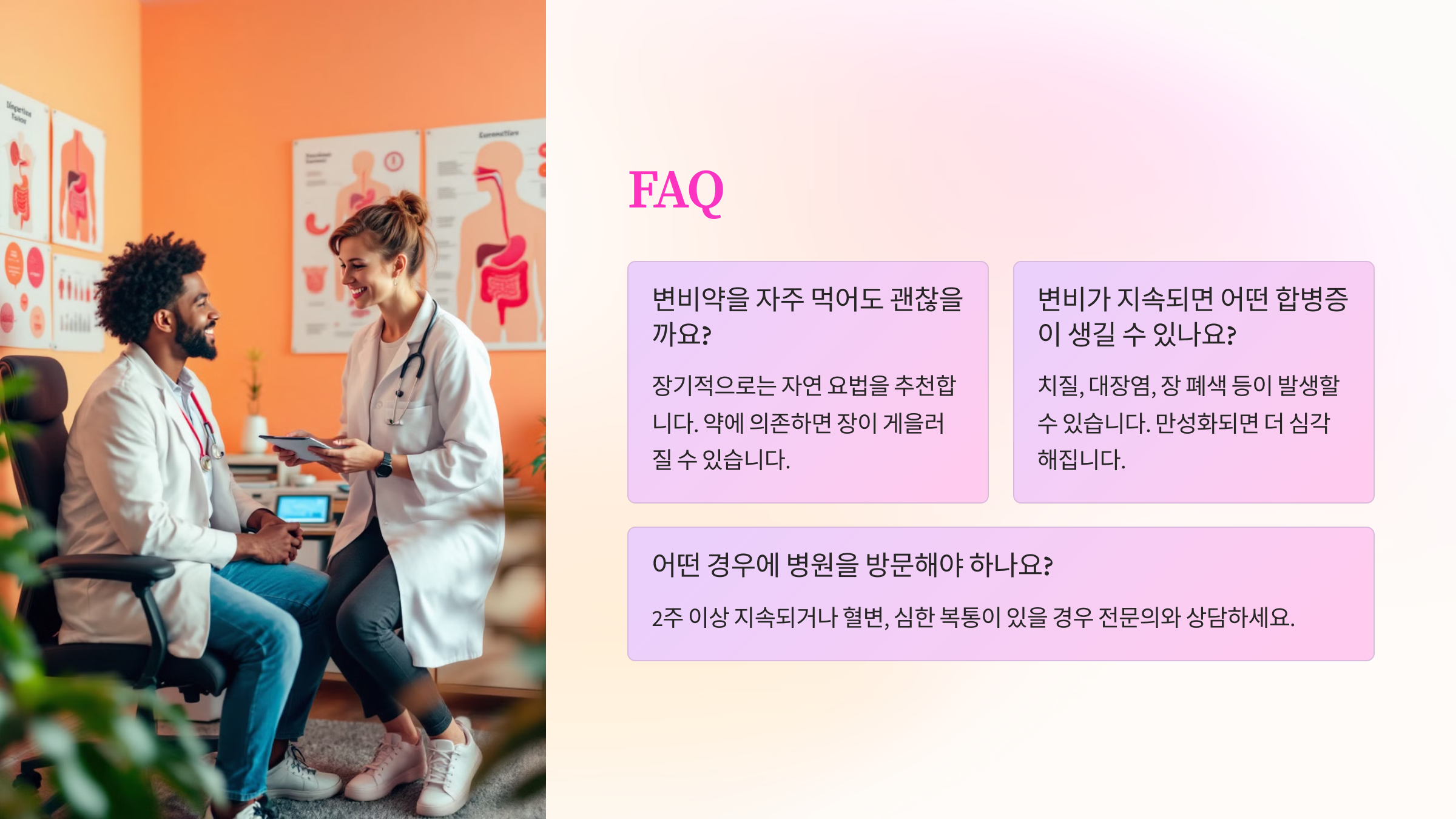 이제 변비와 관련해 자주 묻는 질문을 정리해볼게요! 🎤