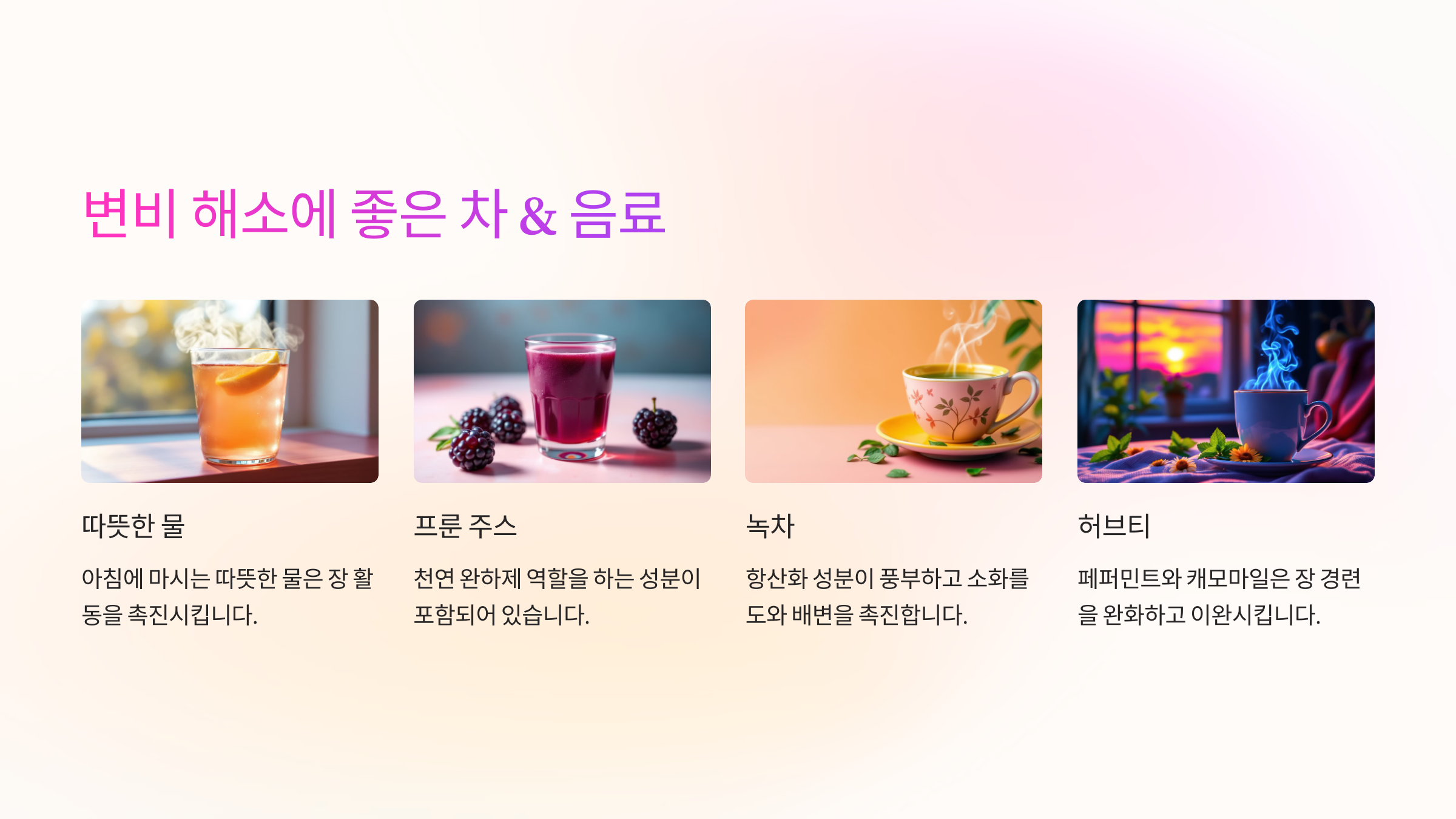 이제 변비 해소에 좋은 차와 음료도 함께 알아볼까요? 🍵