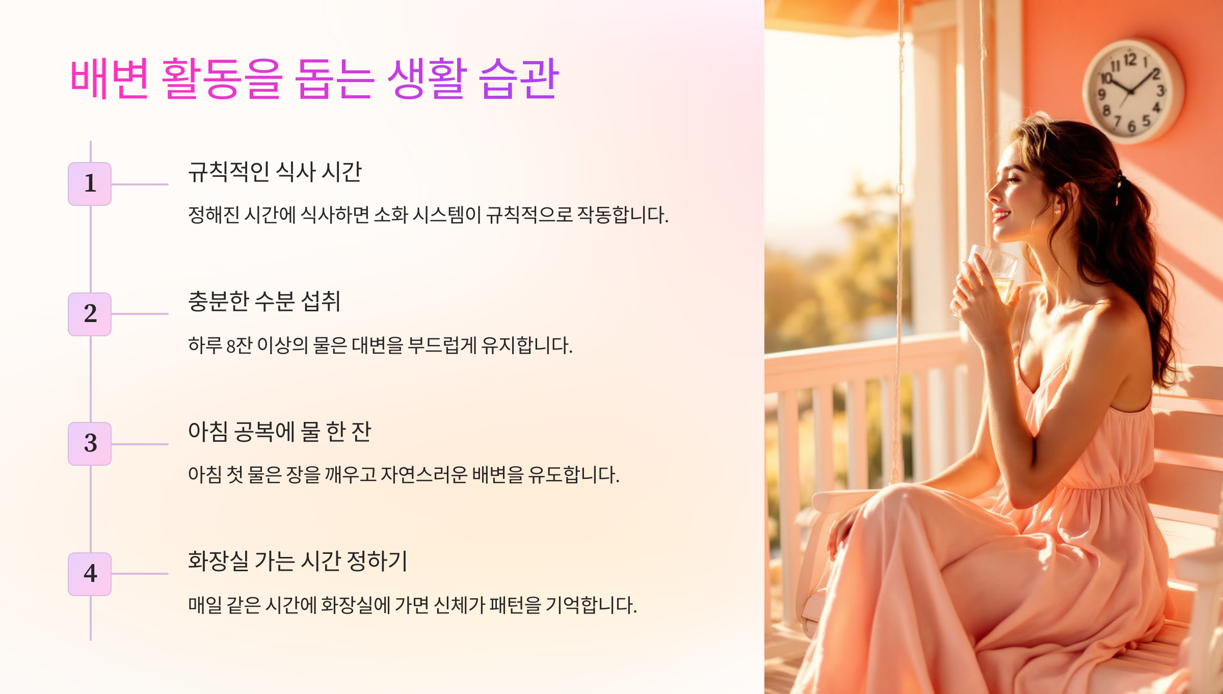 - 🕰️ 규칙적인 배변 습관 만들기: 매일 아침 같은 시간에 화장실 가는 습관을 들이세요.