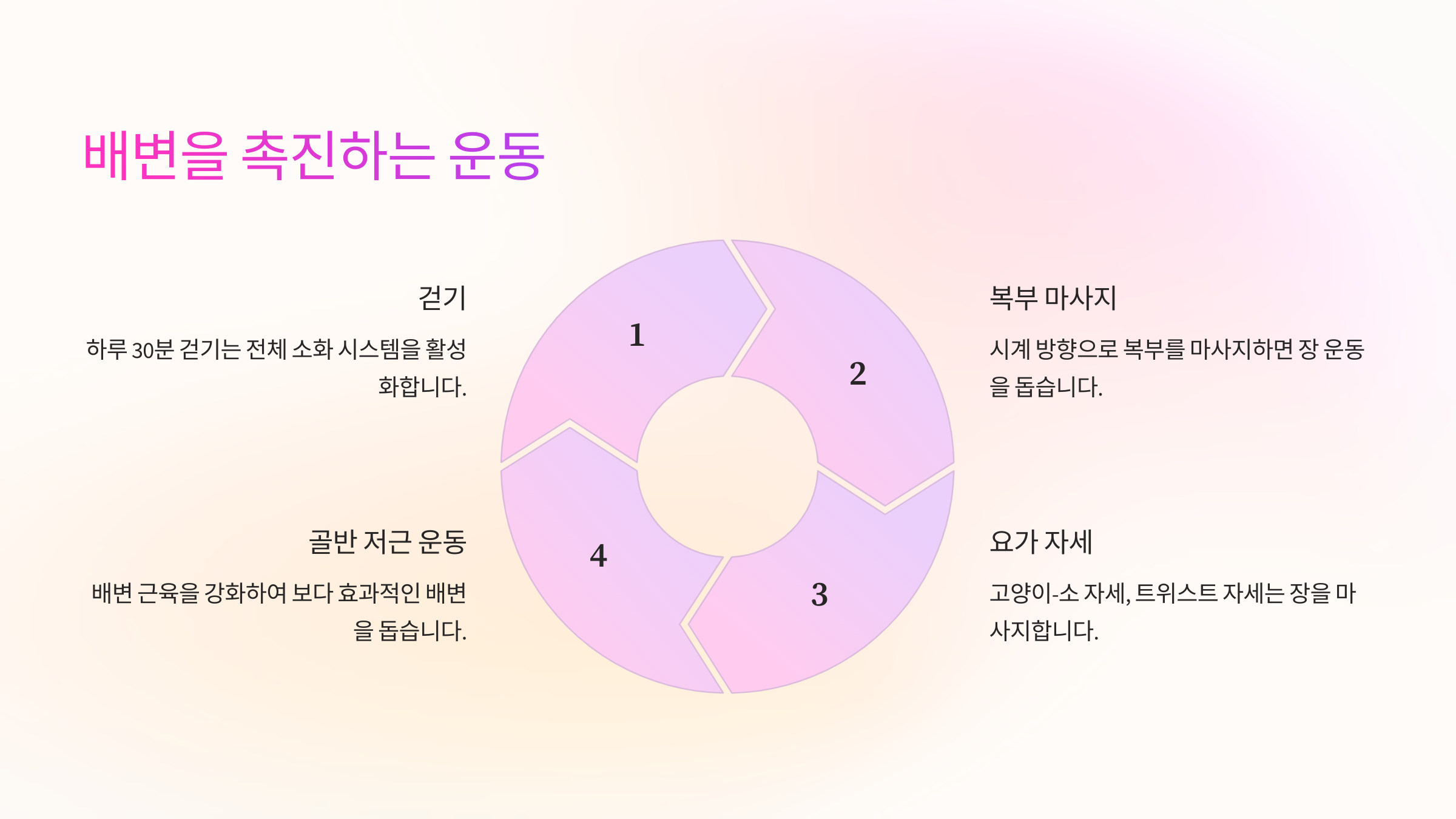 - 🏋️♂️ 복부 마사지 운동: 누워서 배를 원형으로 문지르면 장 운동이 활발해져요.