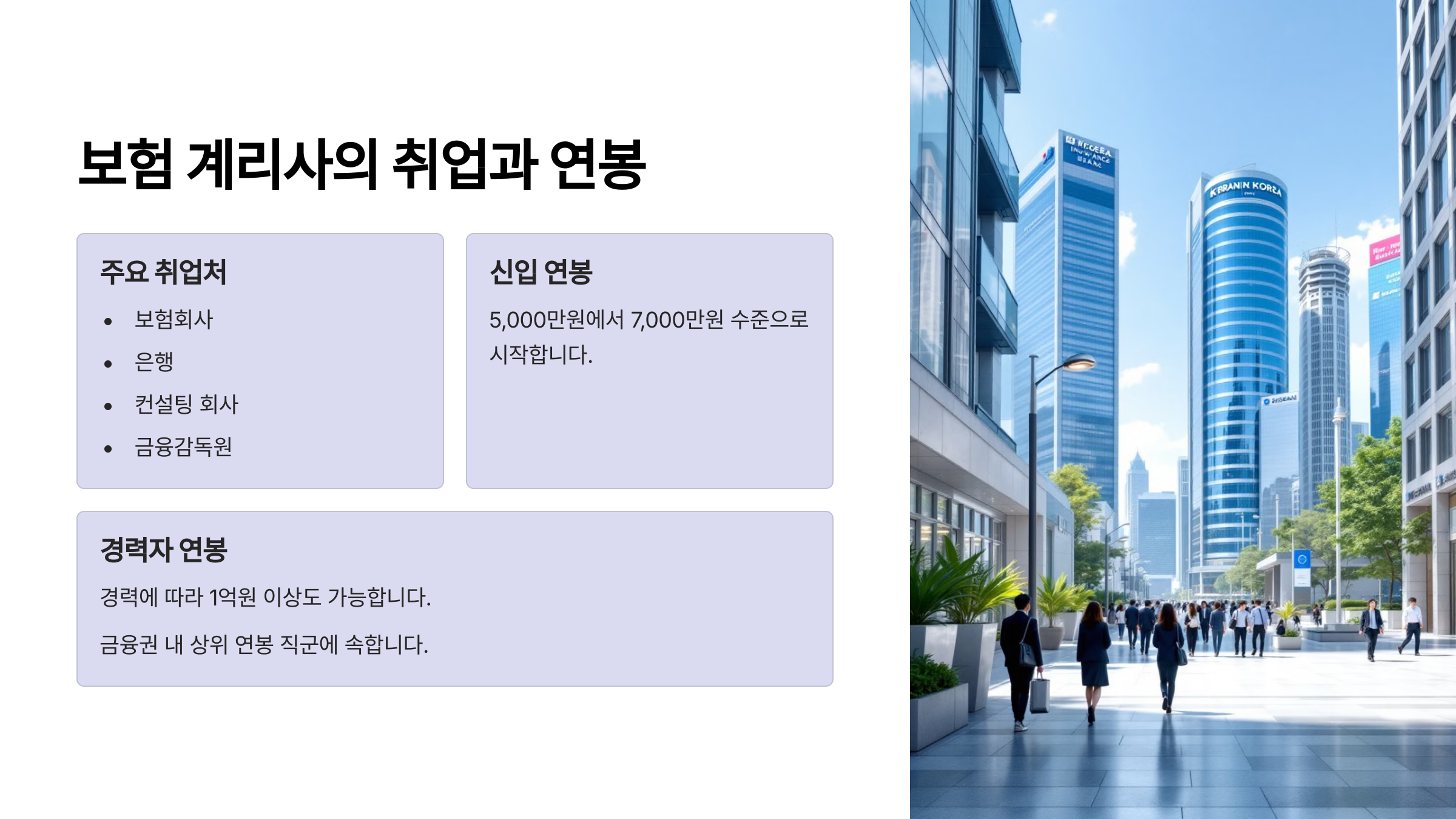 보험 계리사는 보험회사는 물론, 금융권, 정부기관 등 다양한 곳에서 활동할 수 있어요. 연봉도 높은 편이라 금융권 취업을 원하는 분들에게 매력적인 직업이랍니다! 💰