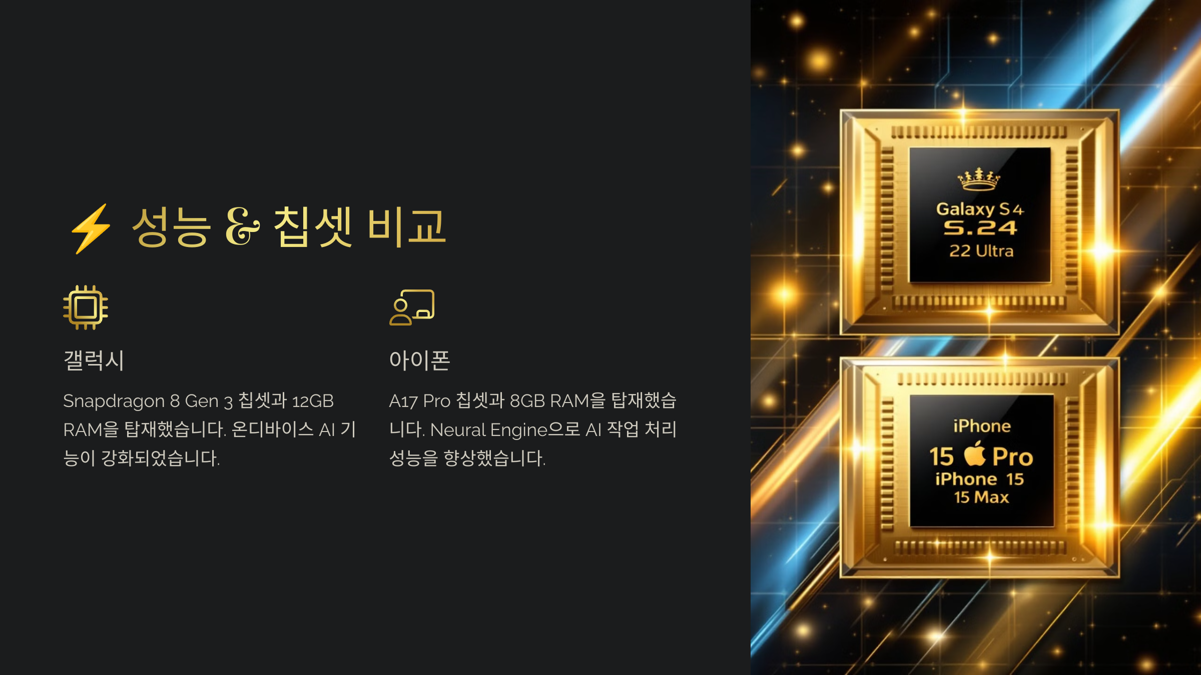 스마트폰의 성능을 결정하는 가장 중요한 요소는 프로세서(칩셋)입니다. 2024년 출시된 갤럭시와 아이폰은 각각 엑시노스 & 스냅드래곤 vs A17 프로 칩을 탑재했어요. 과연 어느 쪽이 더 강력한 성능을 보여줄까요? 🏆