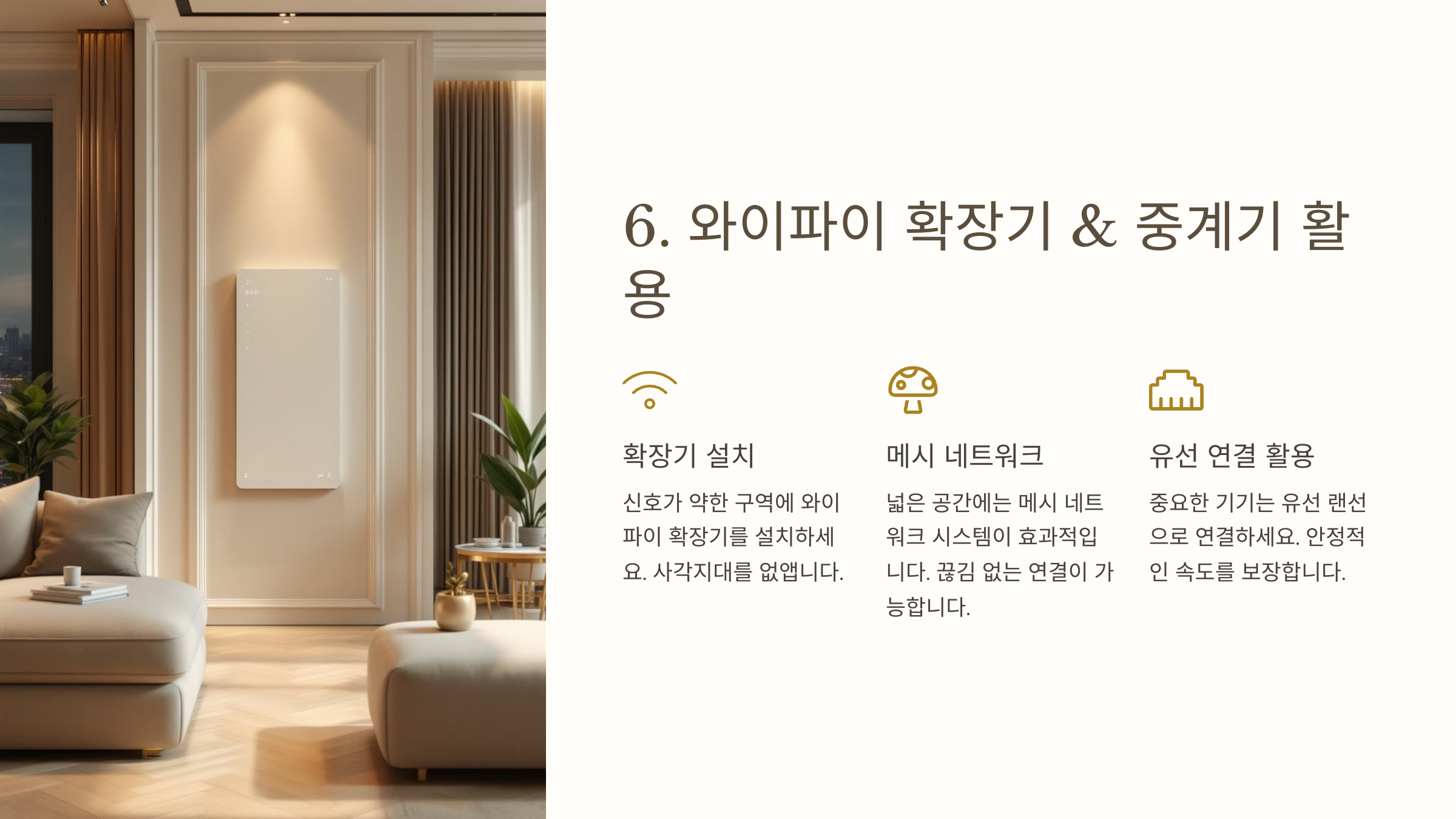 집이 넓거나 방이 많다면 공유기 하나로는 모든 공간에 강한 신호를 제공하기 어려울 수 있어요. 이럴 때는 와이파이 확장기(Wi-Fi Booster)나 중계기(Wi-Fi Repeater)를 활용하면 속도를 개선할 수 있습니다. 🚀📡