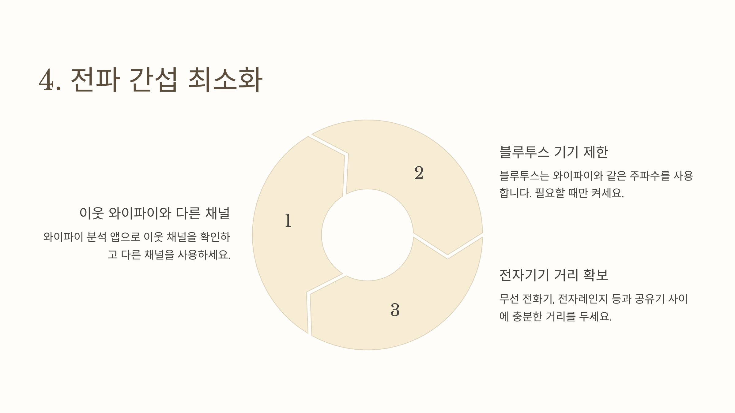 ✔ 전파 간섭을 줄이는 방법 1️⃣ 전자레인지, 무선 전화기 근처에 공유기 두지 않기 – 같은 주파수를 사용해 신호가 약해질 수 있어요. 🍽️📞 2️⃣ 블루투스 기기와의 거리 유지 – 일부 블루투스 장치는 와이파이와 간섭을 일으킬 수 있어요. 🎧 3️⃣ 공유기 채널 변경하기 – 주변 와이파이와 겹치는 채널을 피하면 속도가 개선돼요. 🔄 4️⃣ 5GHz 대역 사용 – 2.4GHz보다 간섭이 적어 속도가 더 빠를 수 있어요. 🌐
