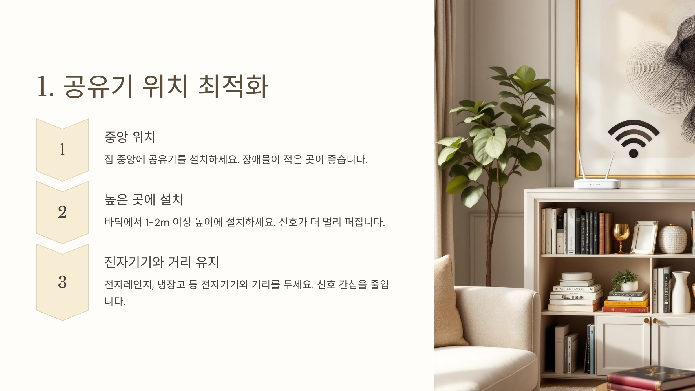 ✔ 공유기 최적 위치 설정 팁 1️⃣ 집 중앙에 배치하기 – 벽 한쪽에 놓으면 반대편 방까지 신호가 약해질 수 있어요. 🏡 2️⃣ 바닥이 아닌 높은 곳에 두기 – 신호는 아래로 퍼지기 때문에 책장 위에 두는 것이 좋아요. 📚 3️⃣ 금속 가전제품 근처 피하기 – 전자레인지, 냉장고 근처에 두면 신호 간섭이 발생해요. ⚡ 4️⃣ 벽이나 장애물이 많은 곳 피하기 – 콘크리트 벽은 신호를 약하게 만들 수 있어요. 🚧
