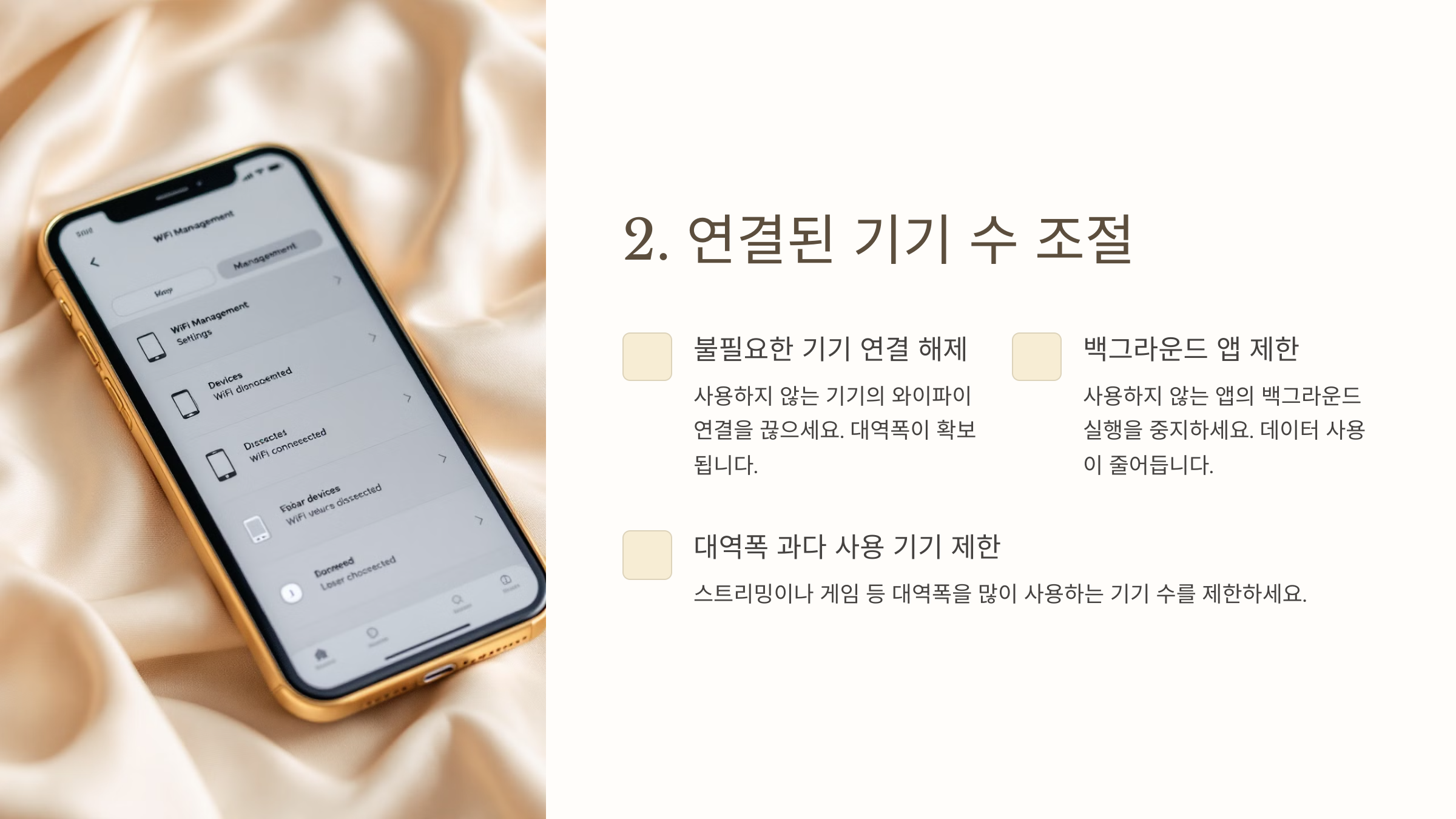 공유기의 위치를 최적화하면 와이파이 속도를 효과적으로 높일 수 있어요! 하지만 너무 많은 기기가 연결되면 속도가 느려질 수도 있는데요. 다음 섹션에서 "연결된 기기 수 조절" 방법을 확인해 보세요! 📱💻