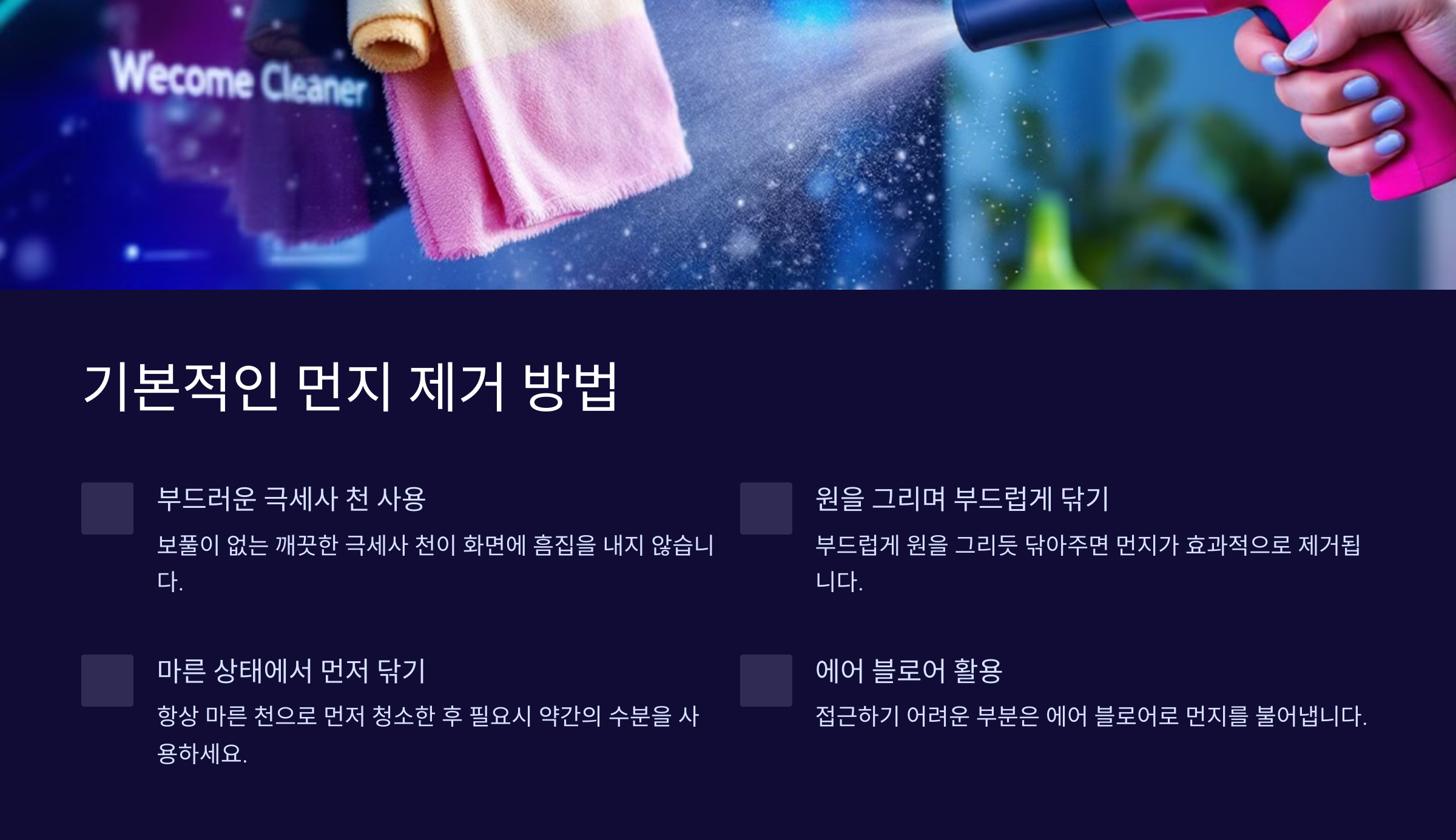 ✔ 기본적인 먼지 제거 방법 1️⃣ TV의 전원을 끄고 완전히 식을 때까지 기다리세요. 2️⃣ 극세사 천이나 부드러운 마른 천으로 먼지를 부드럽게 닦아주세요. 3️⃣ 화면을 강하게 누르지 말고 가볍게 닦아야 흠집이 생기지 않습니다. 4️⃣ 에어 블로어를 사용하면 화면에 묻은 가벼운 먼지를 효과적으로 제거할 수 있어요! 🎯