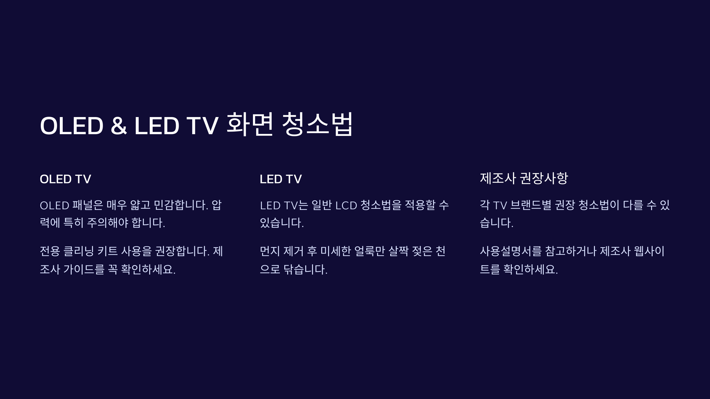 잘못된 청소 방법을 피하면 TV 화면을 오랫동안 깨끗하고 선명하게 유지할 수 있어요! 하지만 TV 화면 종류에 따라 관리 방법이 다를 수 있는데요. 다음 섹션에서 OLED & LED TV 화면 청소법을 확인해 보세요! 📺