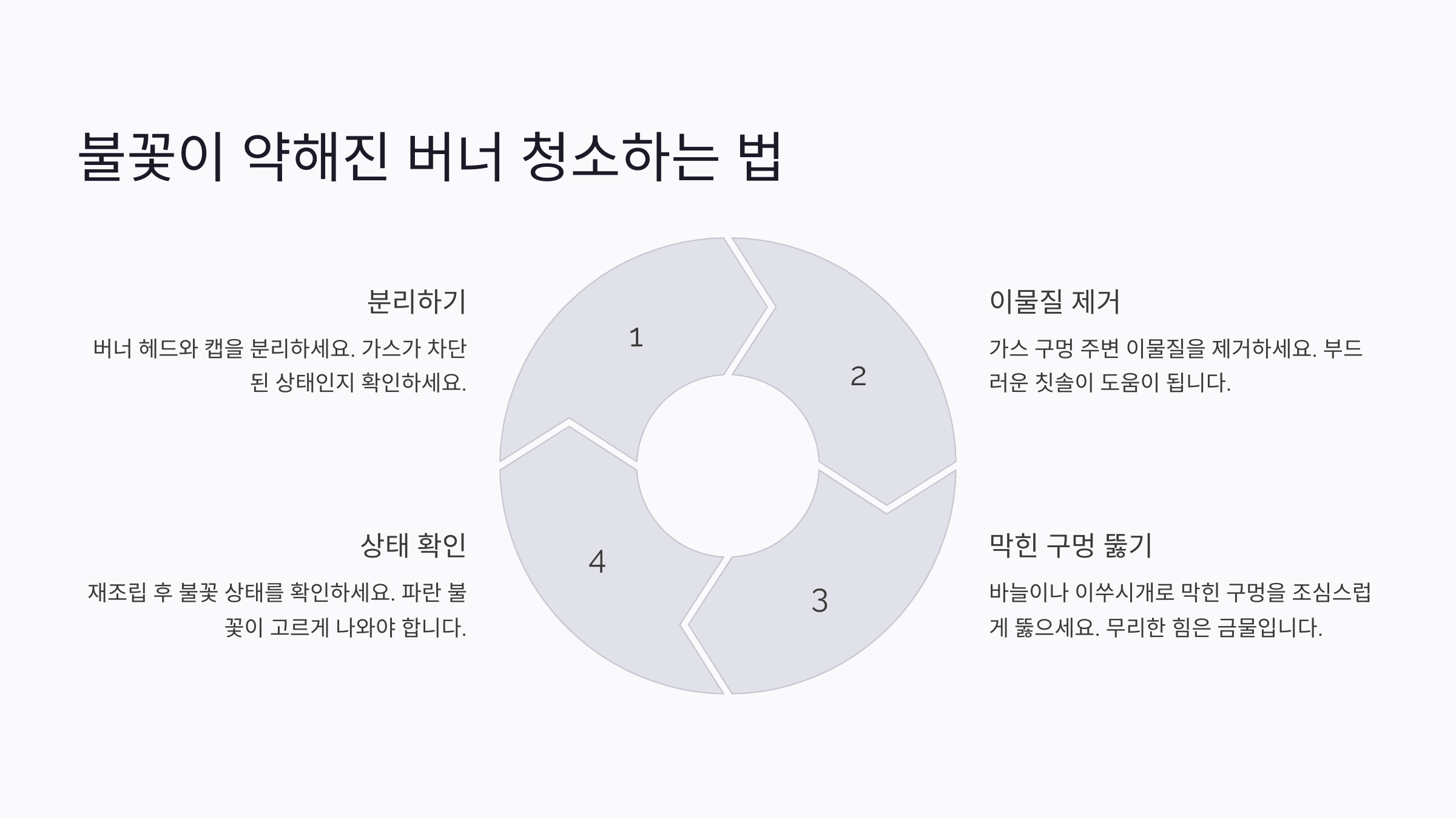 A3. 버너 구멍이 이물질로 막혔을 가능성이 높아요. 이쑤시개나 바늘로 구멍을 뚫어준 후, 베이킹소다 물에 버너를 담갔다가 닦아주면 불꽃이 더 강해질 거예요! 🔥