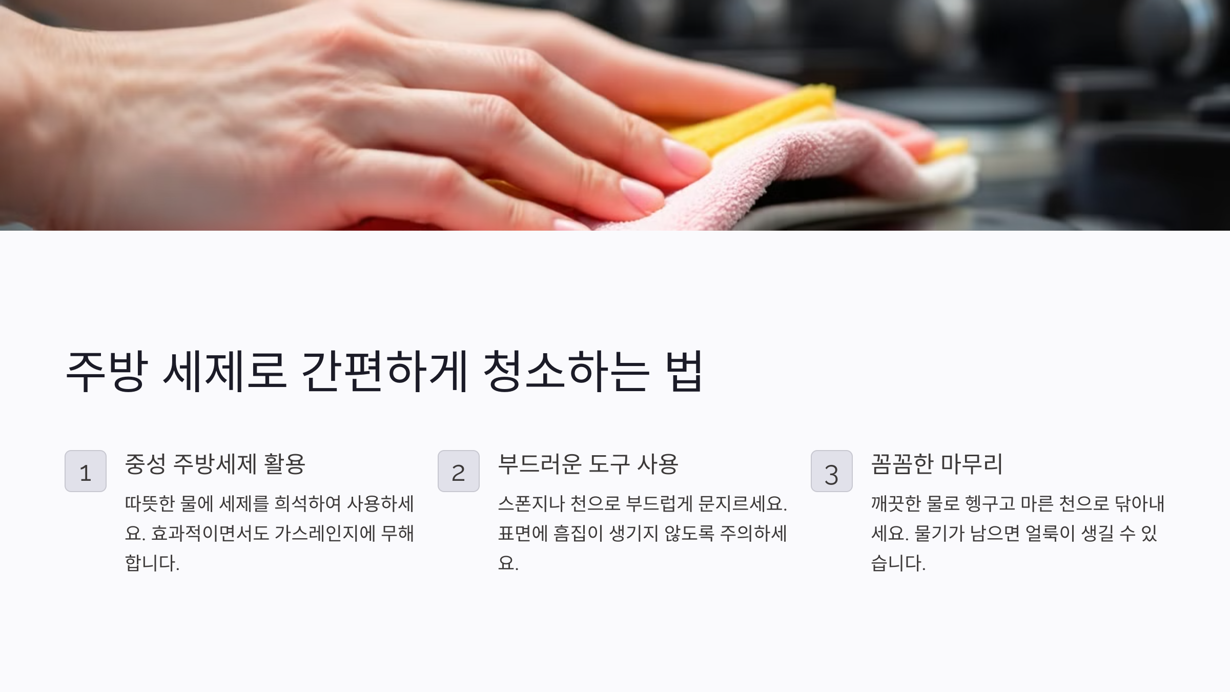 ✔ 요리 후 바로 닦기 음식을 조리한 후 기름이나 소스가 튀었을 때 바로 닦아주면 찌든 때가 쌓이는 걸 막을 수 있어요. 키친타월이나 젖은 행주로 간단히 닦아보세요! 🧽