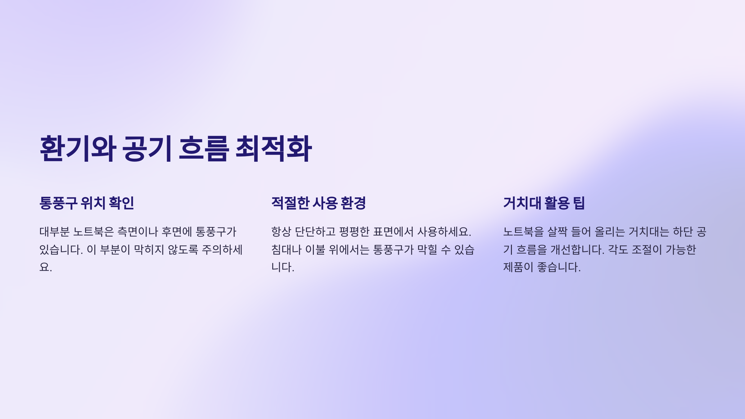 ✔ 환기 최적화 방법 1️⃣ 노트북을 바닥에 직접 놓지 말고, 책이나 노트북 스탠드를 사용해 공간을 확보하세요. 2️⃣ 공기 흐름을 막는 장애물이 없는 개방된 장소에서 사용하세요. 3️⃣ 실내 온도가 너무 높다면 선풍기나 에어컨을 활용해 노트북 주변 온도를 낮추세요! ❄️