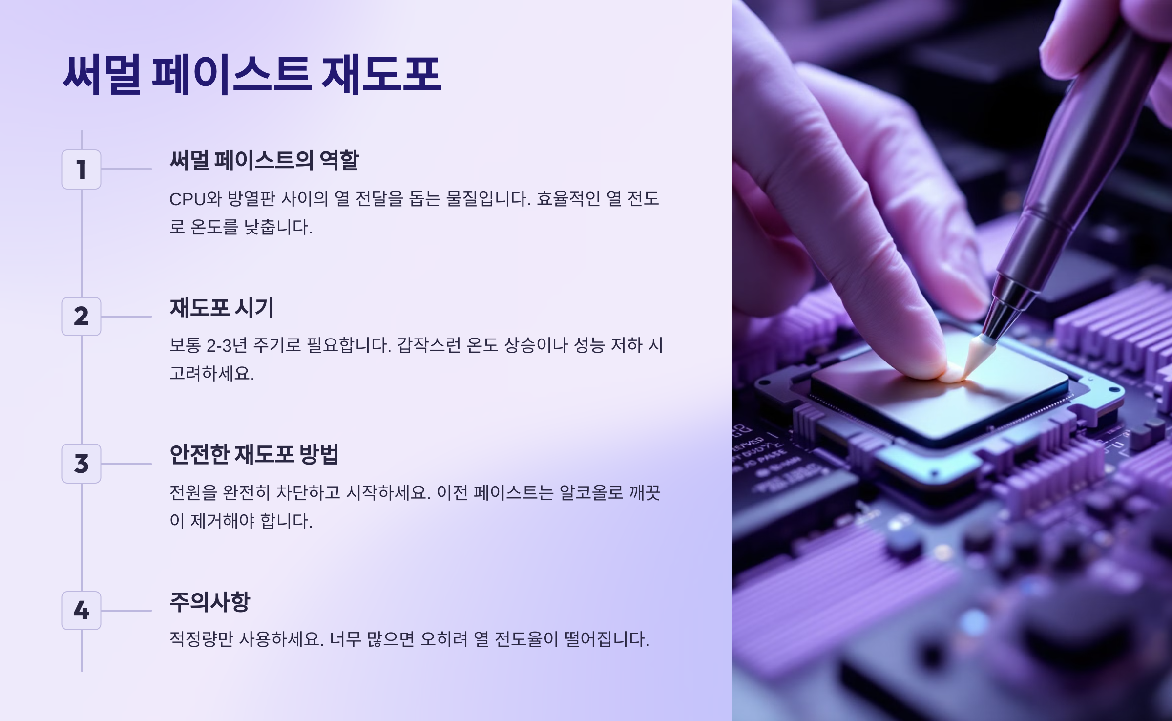 노트북 내부의 CPU와 GPU는 열을 효과적으로 분산하기 위해 '써멀 페이스트'라는 열전도 물질을 사용해요. 하지만 시간이 지나면 써멀 페이스트가 마르거나 경화되어 냉각 효과가 떨어질 수 있어요! 🔥