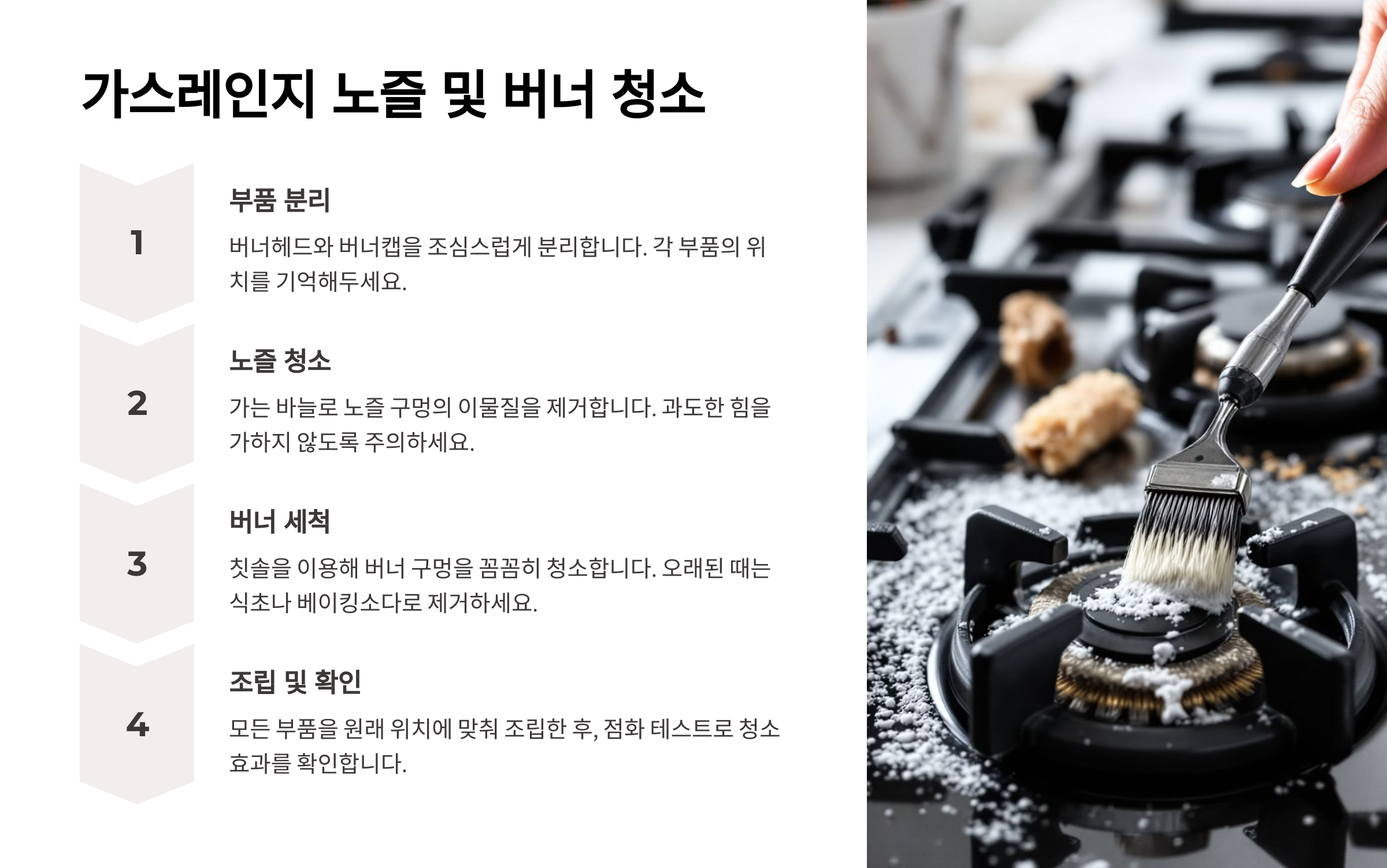 ✅ 버너 세척: 버너를 분리한 뒤, 베이킹소다와 식초를 섞은 물에 30분 정도 담가두면 찌든 때가 제거돼요. 이후 깨끗한 물로 헹구고 완전히 말린 후 장착하세요.