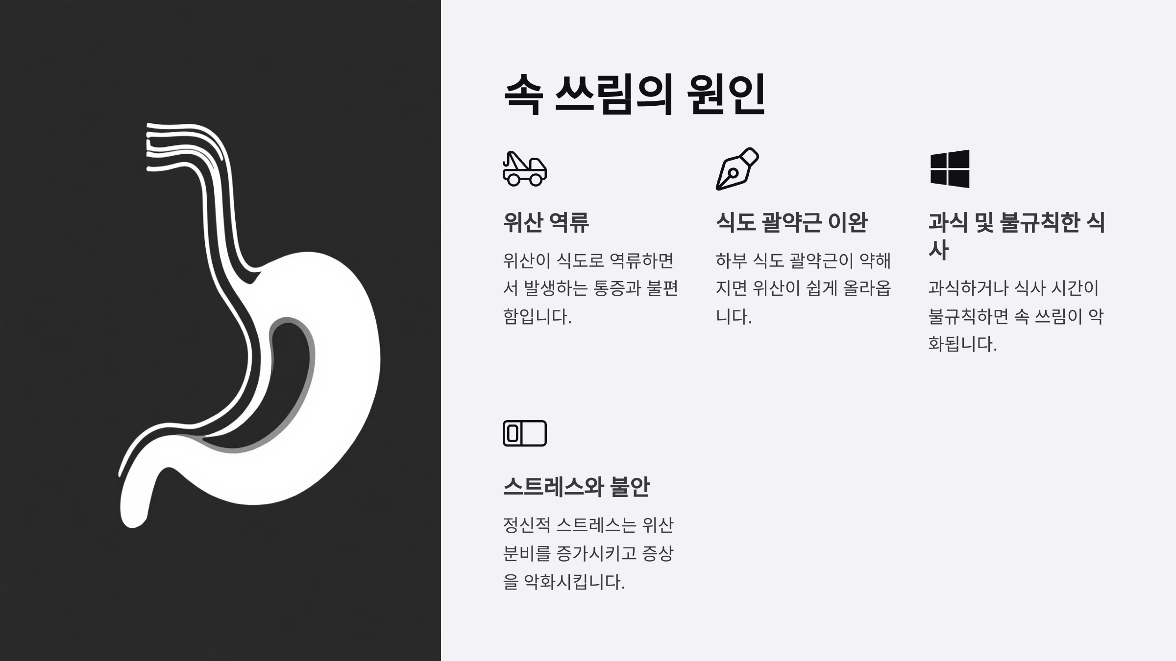 속 쓰림이 생기는 이유는 다양해요. 가장 큰 원인은 위산이 식도로 역류하는 것이에요. 위산이 과하게 분비되거나 위장 내 압력이 증가하면 속이 쓰리고 타는 듯한 느낌이 들 수 있어요. 🤯
