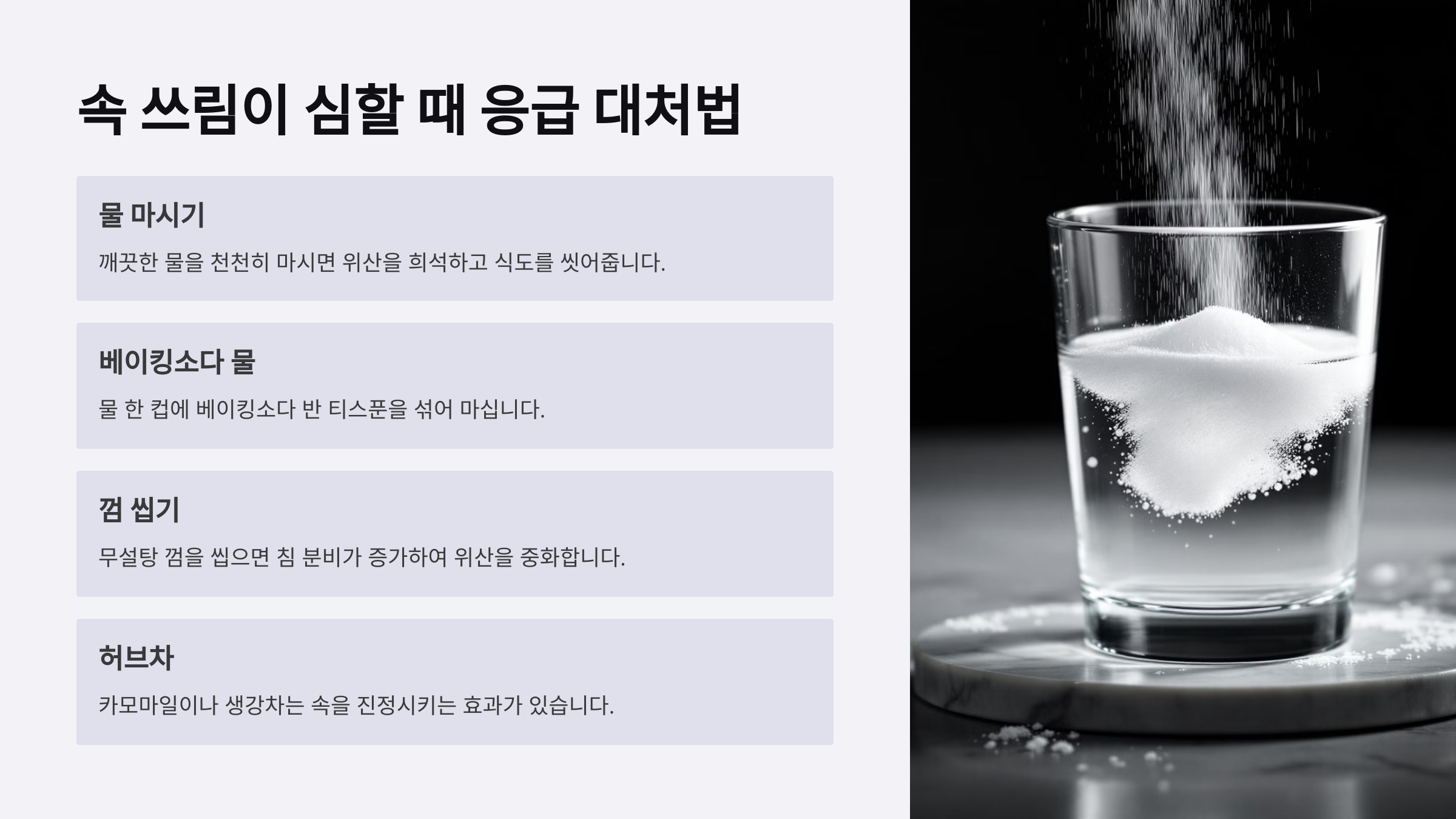 속 쓰림이 심하게 발생했을 때 즉시 할 수 있는 응급 대처법도 알아볼까요? 🚨