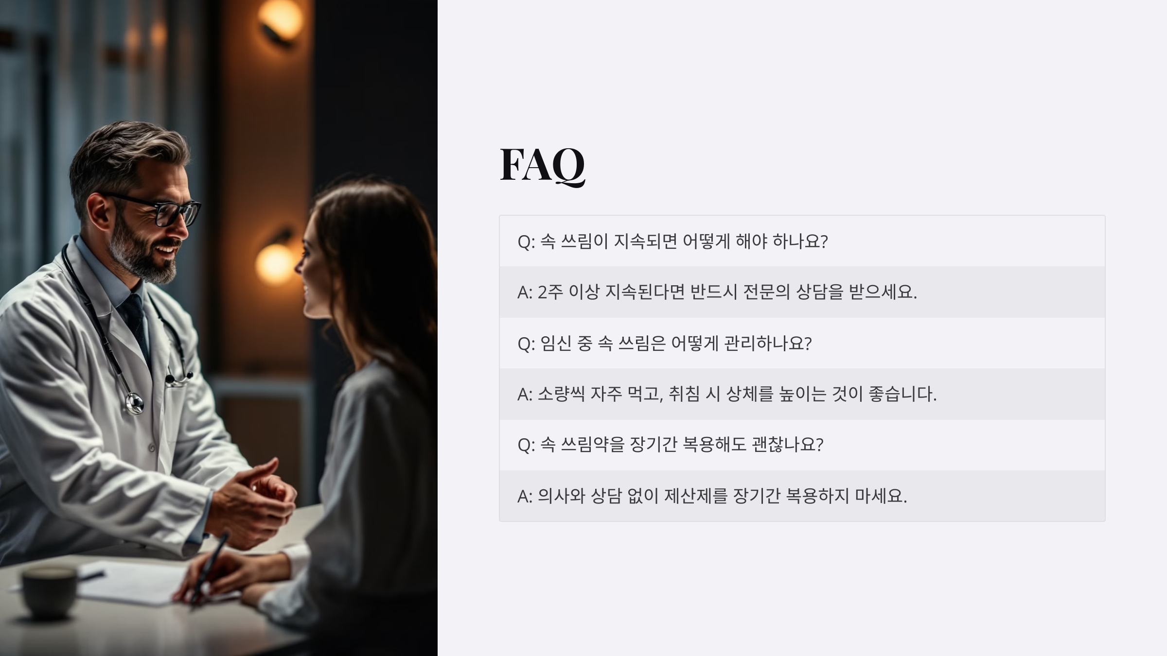 이제 속 쓰림과 관련한 자주 묻는 질문(FAQ)을 정리해볼게요! 🎤