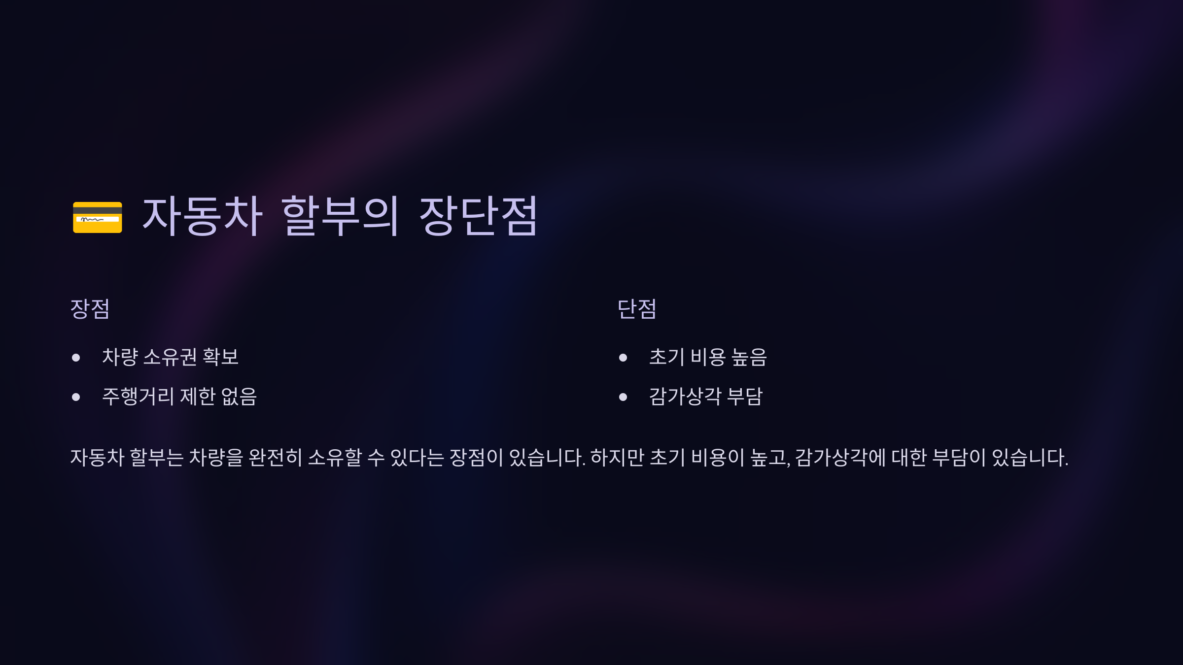 ✅ 자동차 할부가 적합한지 확인했나요? 이제 자동차 리스의 장단점도 살펴볼까요? 🚗