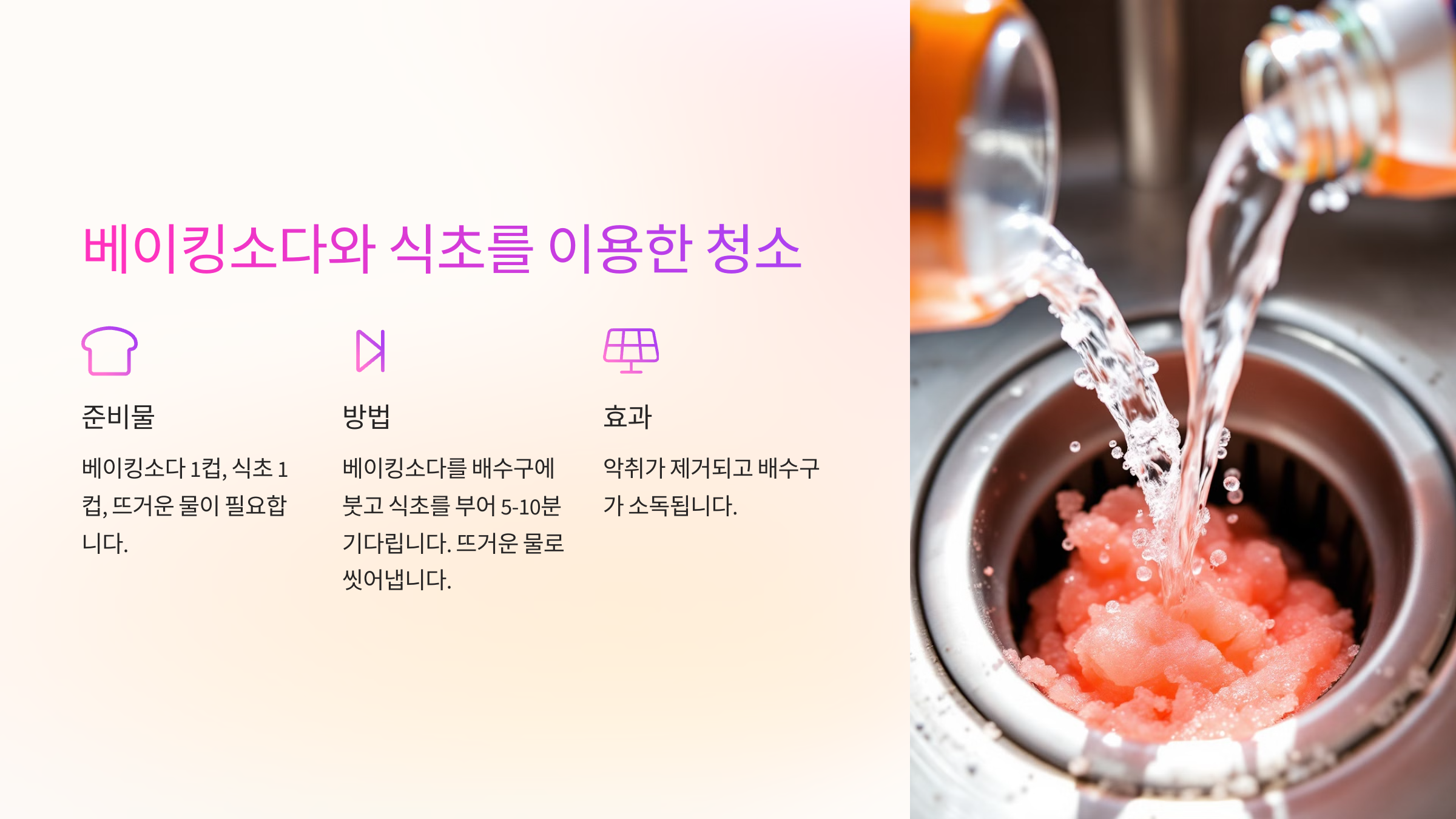 베이킹소다와 식초는 싱크대 배수구 냄새를 제거하는 가장 안전하고 효과적인 방법이에요! 특히 찌든 때와 세균을 동시에 제거할 수 있어 배수구를 더욱 깨끗하게 유지할 수 있답니다. 🧼
