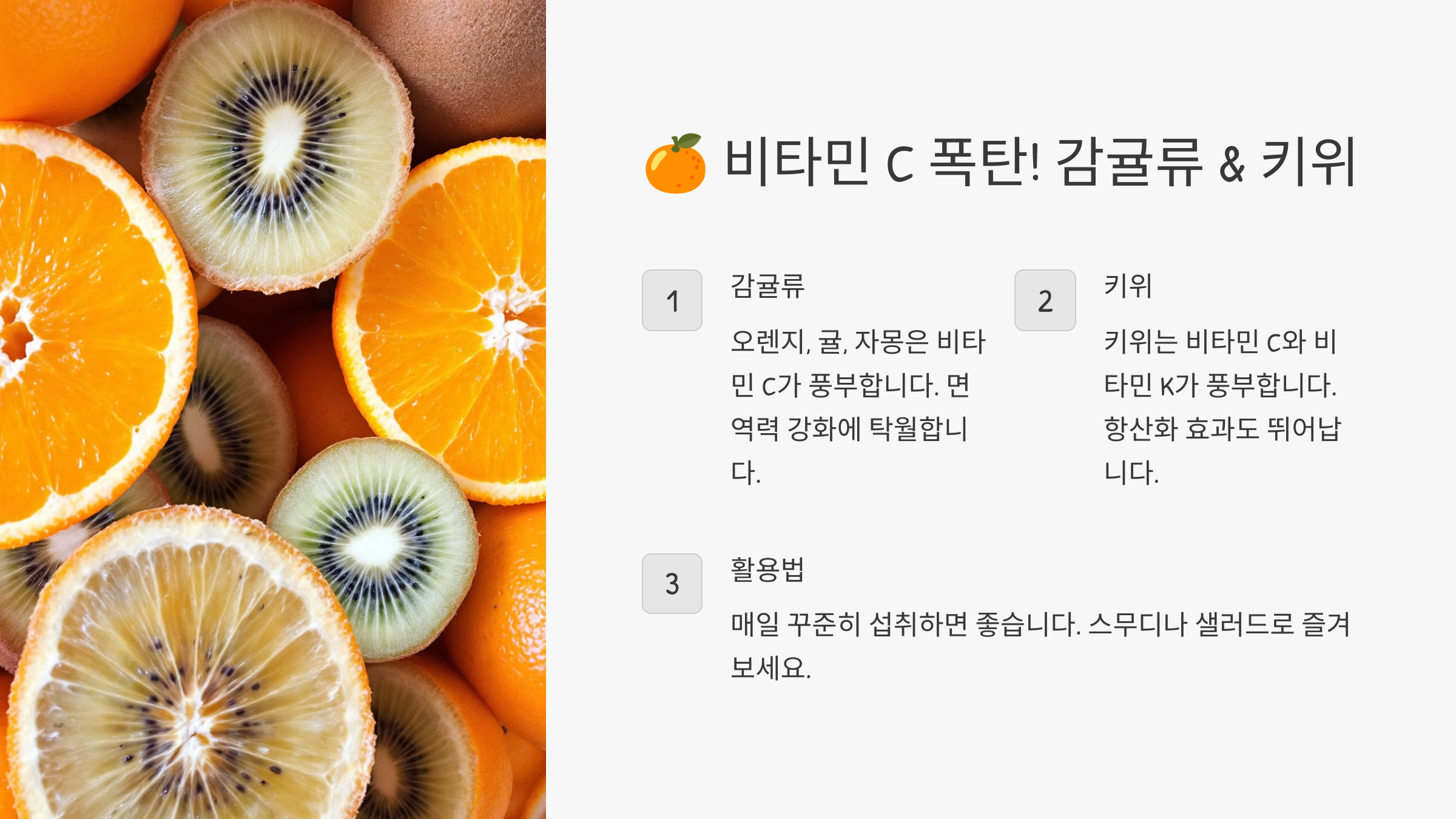 - 🍊 비타민 C 음식 → 감귤류, 키위, 파프리카