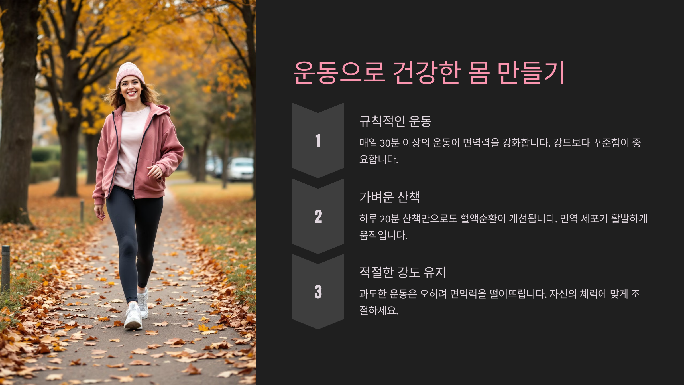 적절한 습도를 유지하면 호흡기가 건강해지고 감기 예방 효과도 높아져요! 하지만 면역력을 높이려면 규칙적인 운동도 필수인데요. 다음 섹션에서 운동으로 건강한 몸을 만드는 방법을 확인해 보세요! 🏃♂️