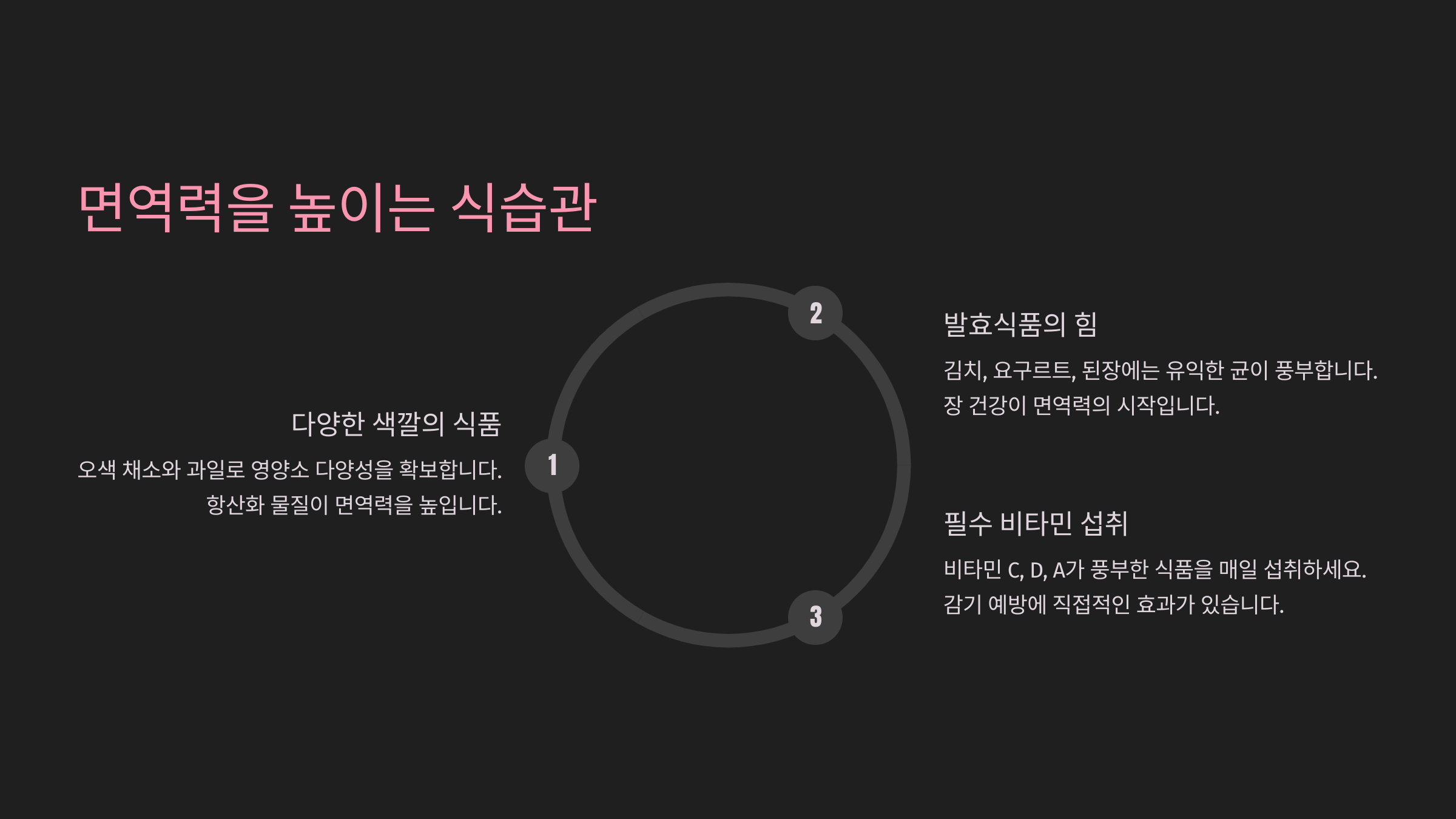 손만 깨끗이 씻어도 감기에 걸릴 확률을 크게 줄일 수 있어요! 하지만 면역력이 약하면 바이러스에 쉽게 노출될 수 있는데요. 다음 섹션에서 면역력을 높이는 식습관을 확인해 보세요! 🥗