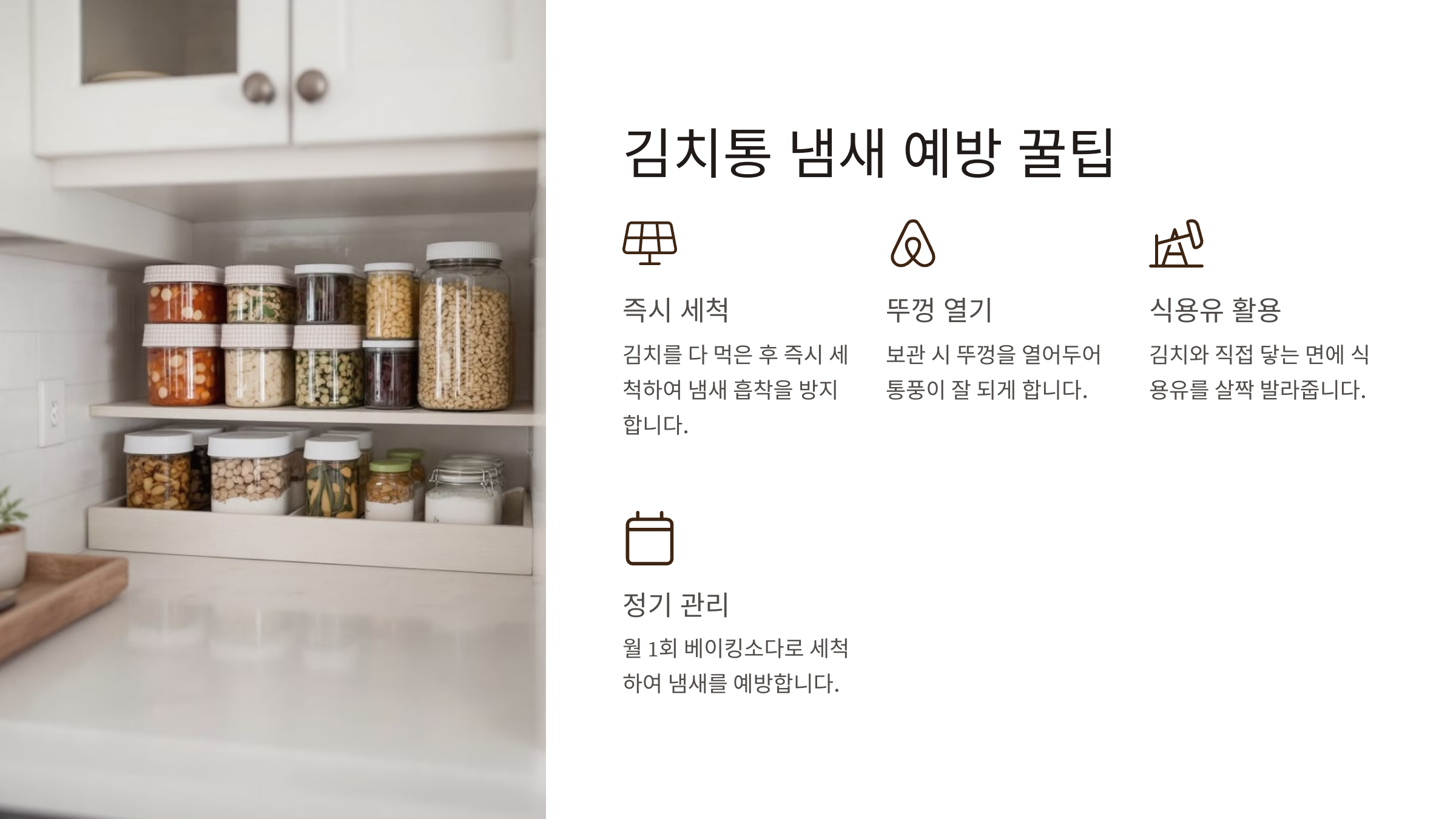 김치통을 깨끗이 씻어도 냄새가 남는 경우가 많죠? 미리 예방하면 냄새 걱정 없이 사용할 수 있어요! 몇 가지 간단한 습관만 들이면 김치통을 더욱 깨끗하게 유지할 수 있답니다. 😊