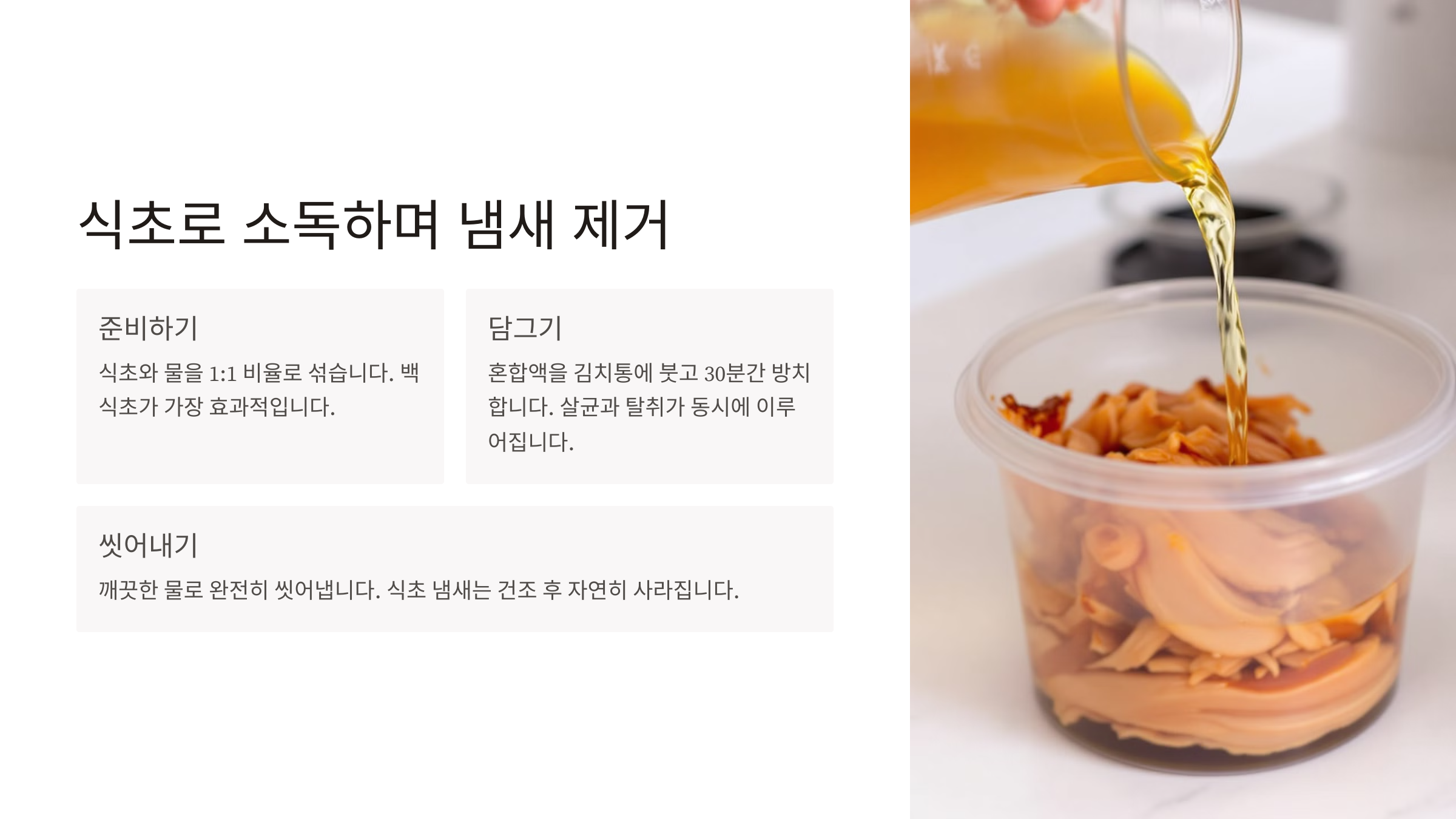 ✔ 방법: 식초 활용법 1️⃣ 김치통에 식초와 물을 1:1 비율로 섞어 가득 채워 주세요. 2️⃣ 뚜껑을 닫고 1시간 동안 그대로 둡니다. 3️⃣ 이후 깨끗한 물로 헹구면 살균과 냄새 제거까지 한 번에 끝! ✨